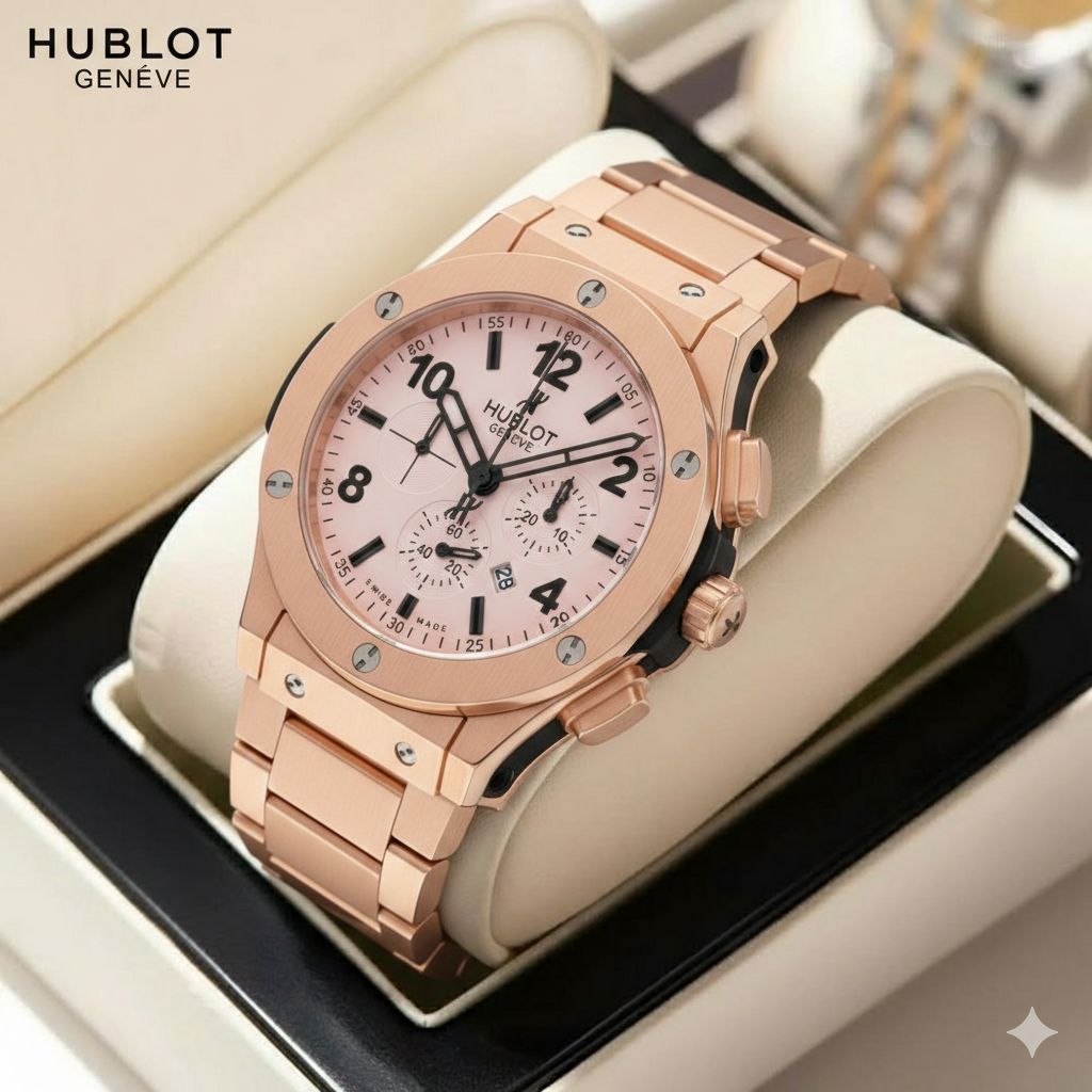 ساعت مچی مردانه کد 2301 مردانه فلزی برند هابلوت HUBLOT قفل پروانه ای باکیفیت طراحی خاص و زیبا بند فلزی سنگین صفحه رز گلد موتور کوارتز طرح سه موتوره دارای روز شمار