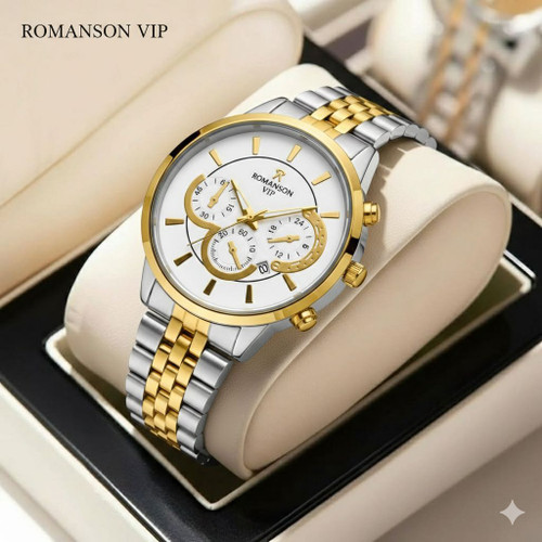 ساعت مچی مردانه کد 2305 مردانه برند رومانسون ROMANSON باکیفیت بدنه استیل طراحی خاص و زیبا صفحه سفید موتور کوارتز روز شمار طرح سه موتوره