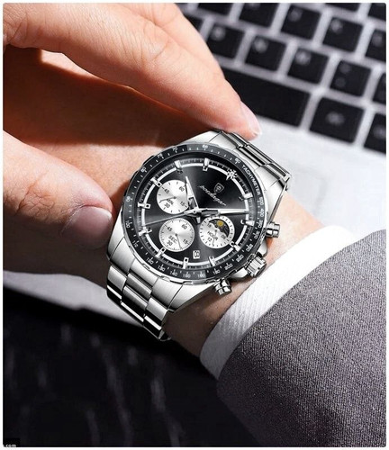ساعت پوداگار مردانه کرنوگراف دارای روز شمار نمایش مون استار عقربه شب نما برند اورجینال شرکتی بند استیل ضدآب تا عمق بالا رنگ ثابت قفل دو پروانه