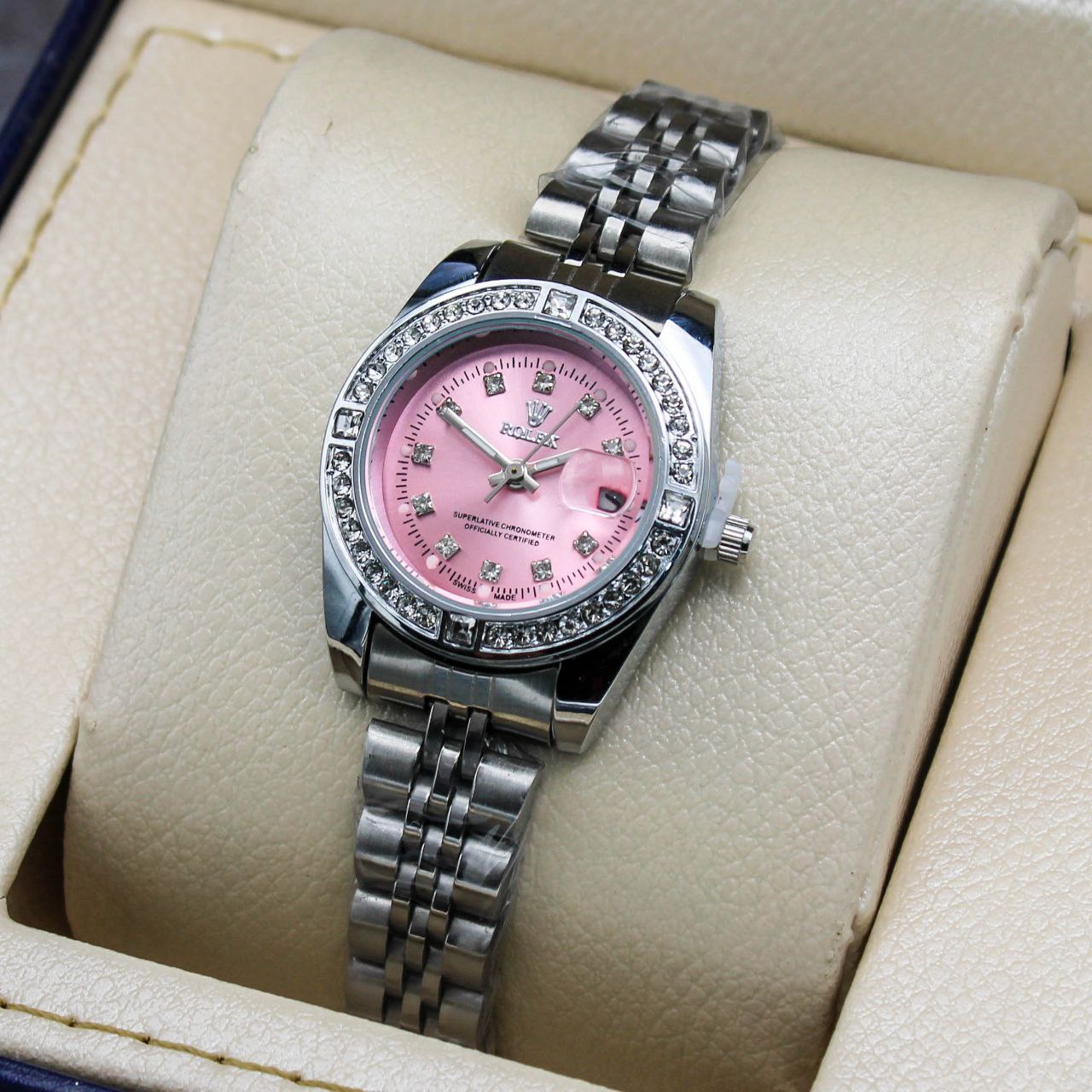 ساعت مچی زنانه ROLEX ✅تقویم دار، نگین دار ✅بند استیل، قفل کلیپسی، رنگبندی ✅جعبه کادویی و باطری