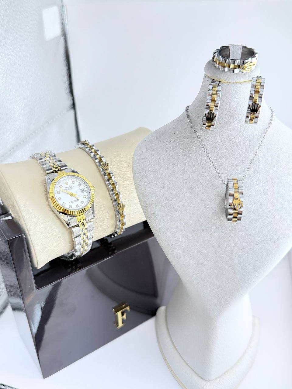 ساعت رولکس تقویم دار طرح دیجاست و تمام ست کامل رولکس تاج دار گردبند و گوشواره و حلقه و دسبند طراحی جدید و خاص
