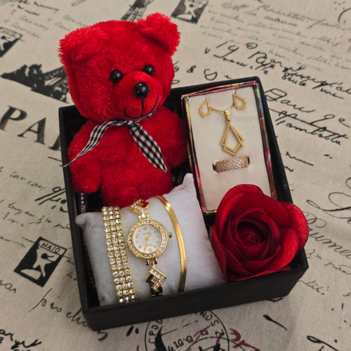 پک زنانه و دخترانه ساعت و دستبند و نیمست استیل و حلقه بهمراه باکس و عروسک و گل مصنوعی