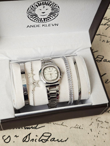 ست ساعت زنانه و دخترانه ساعت و دستبند و نیمست استیل و حلقه بهمراه جعبه کادویی و باتری یدکی