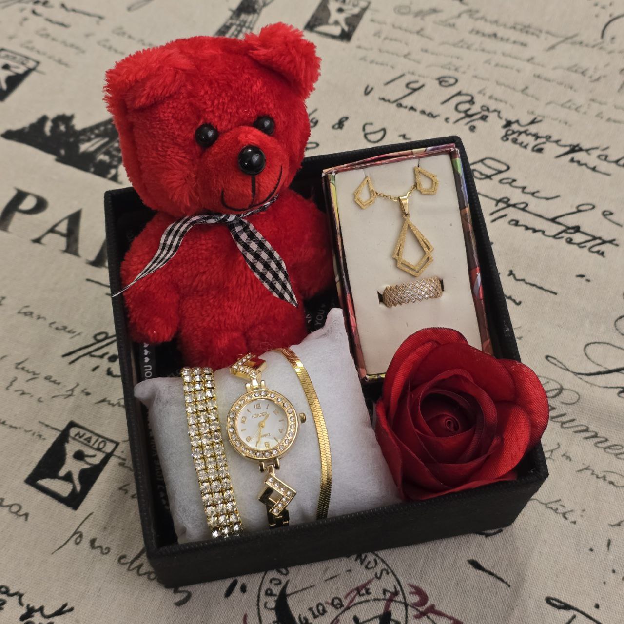 پک زنانه و دخترانه ساعت و دستبند و نیمست استیل و حلقه بهمراه باکس و عروسک و گل مصنوعی