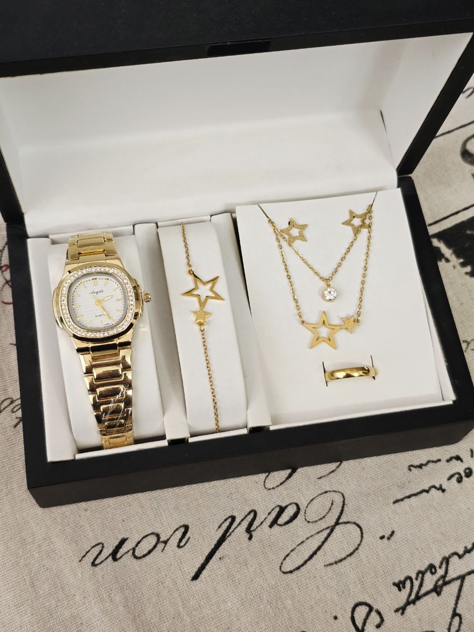ست ساعت زنانه و دخترانه ساعت و دستبند و نیمست استیل و حلقه بهمراه جعبه کادویی و باتری یدکی
