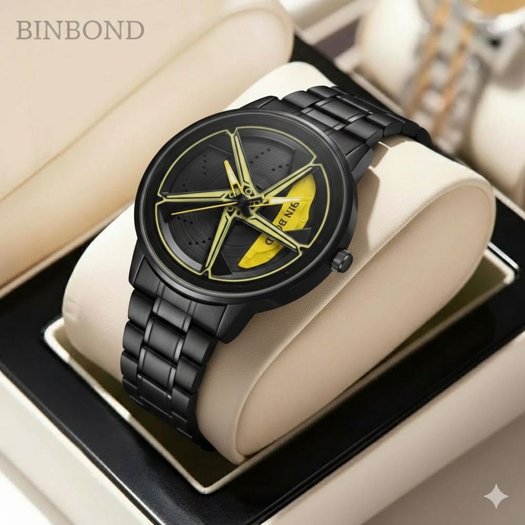 ساعت مچی مردانه کد 2289 مردانه برند بین باند BIN BOND رینگ چرخشی ضدآب با کیفیت قاب و بند عالی اسپرت برای آقایان طرح رینگ ماشین قفل کلیپسی موتورکوارتز بند استیل خاص وجذاب