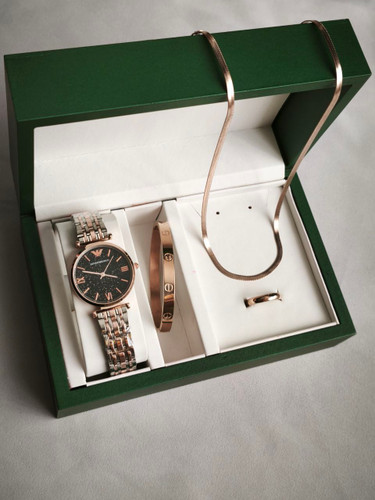 باکس هدیه زنانه و دخترانه ساعت و دستبند و نیمست استیل طلایی رنگ ثابت و باکس و گل