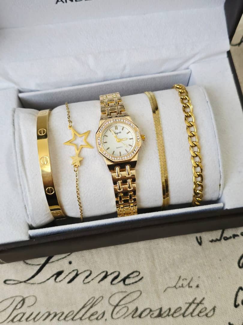 ست زنانه و دخترانه ساعت و دستبند و نیمست استیل و انگشتر جواهری