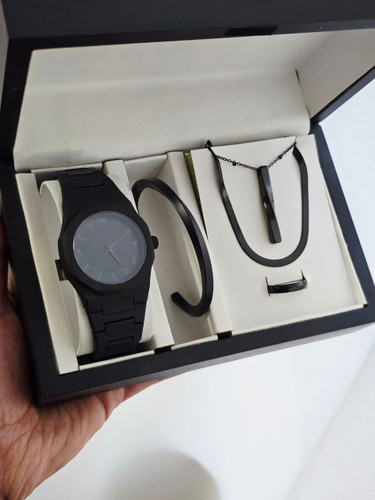 ست مردانه ساعت و دستبند گردنبند و حلقه بهمراه جعبه کادویی و باتری یدکی