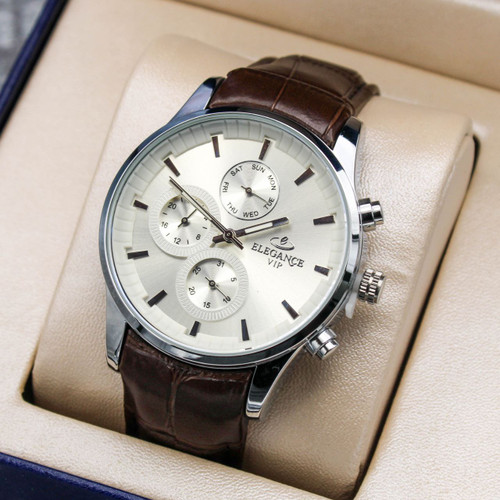 ساعت مچی مردانه ELEGANCE ✅موتور ژاپن، هر سه موتور فعال ✅فول تایم، تقویم و روزشمار ✅نمایش ۲۴ ساعت شبانه روز ✅بند چرمی، قفل پروانهای، رنگ ثابت✅جعبه و باطری