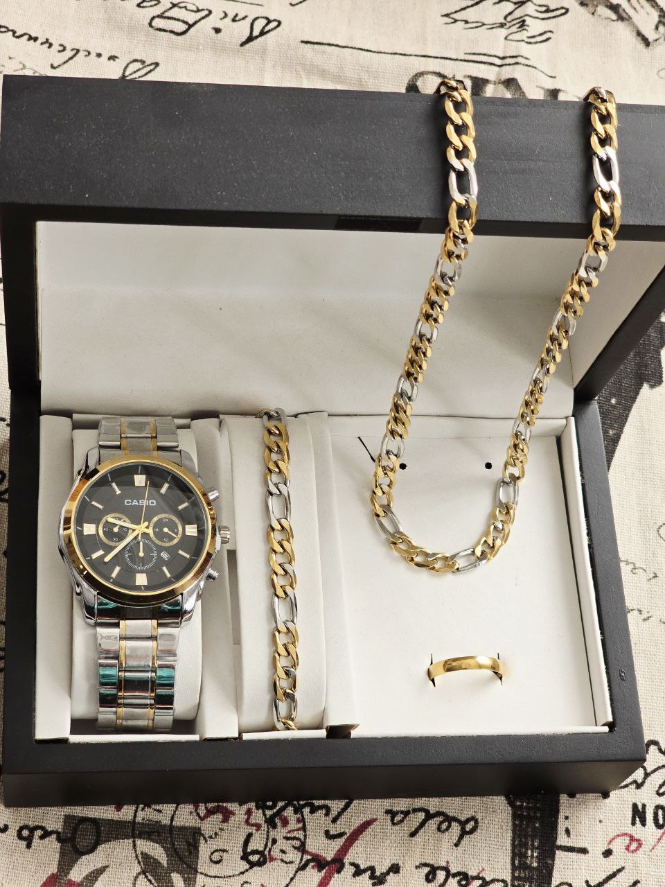 ست مردانه ساعت کاسیو و دستبند و گردنبند زنجیر استیل طلایی و حلقه استیل( سایز ۶ تا ۱۰) بهمراه جعبه کادویی و باتری یدکی