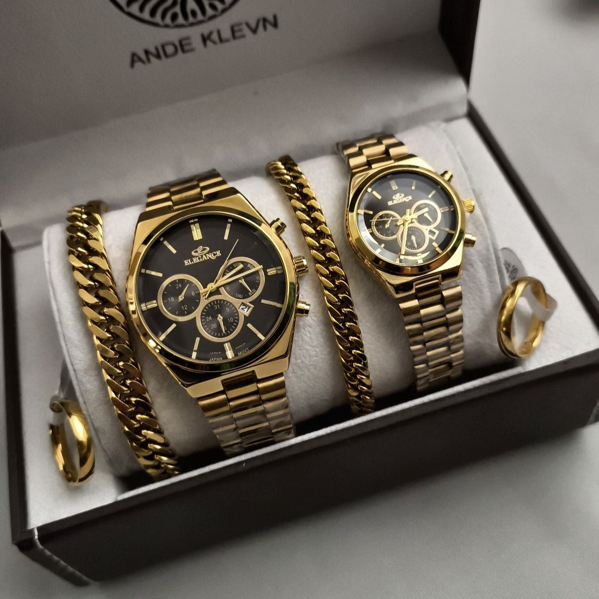 ست ساعت زنانه و مردانه برند الگانس بند استیل ساعت ها دارای روزشمار دو عدد دستبند و حلقه به همراه جعبه کادویی