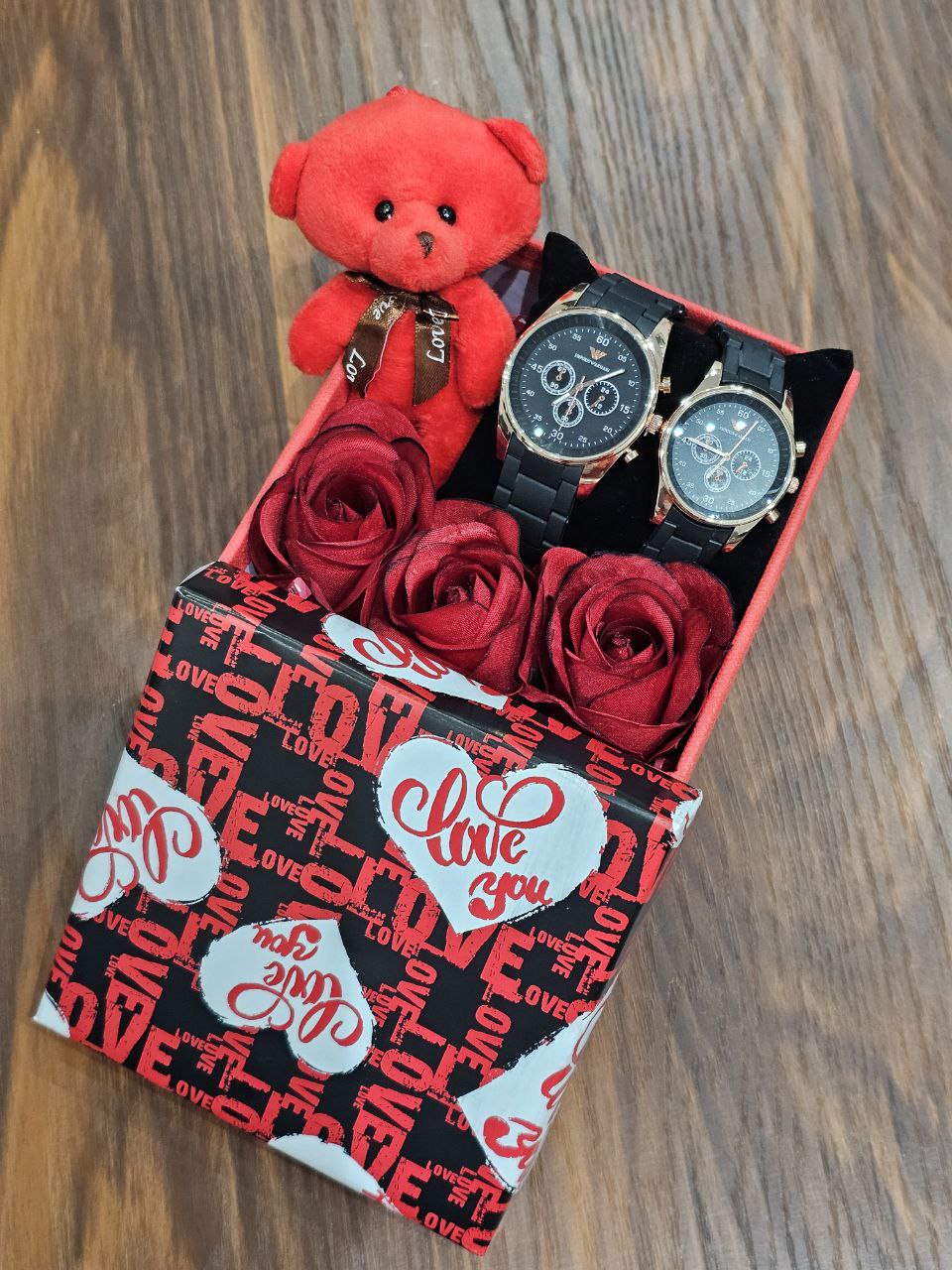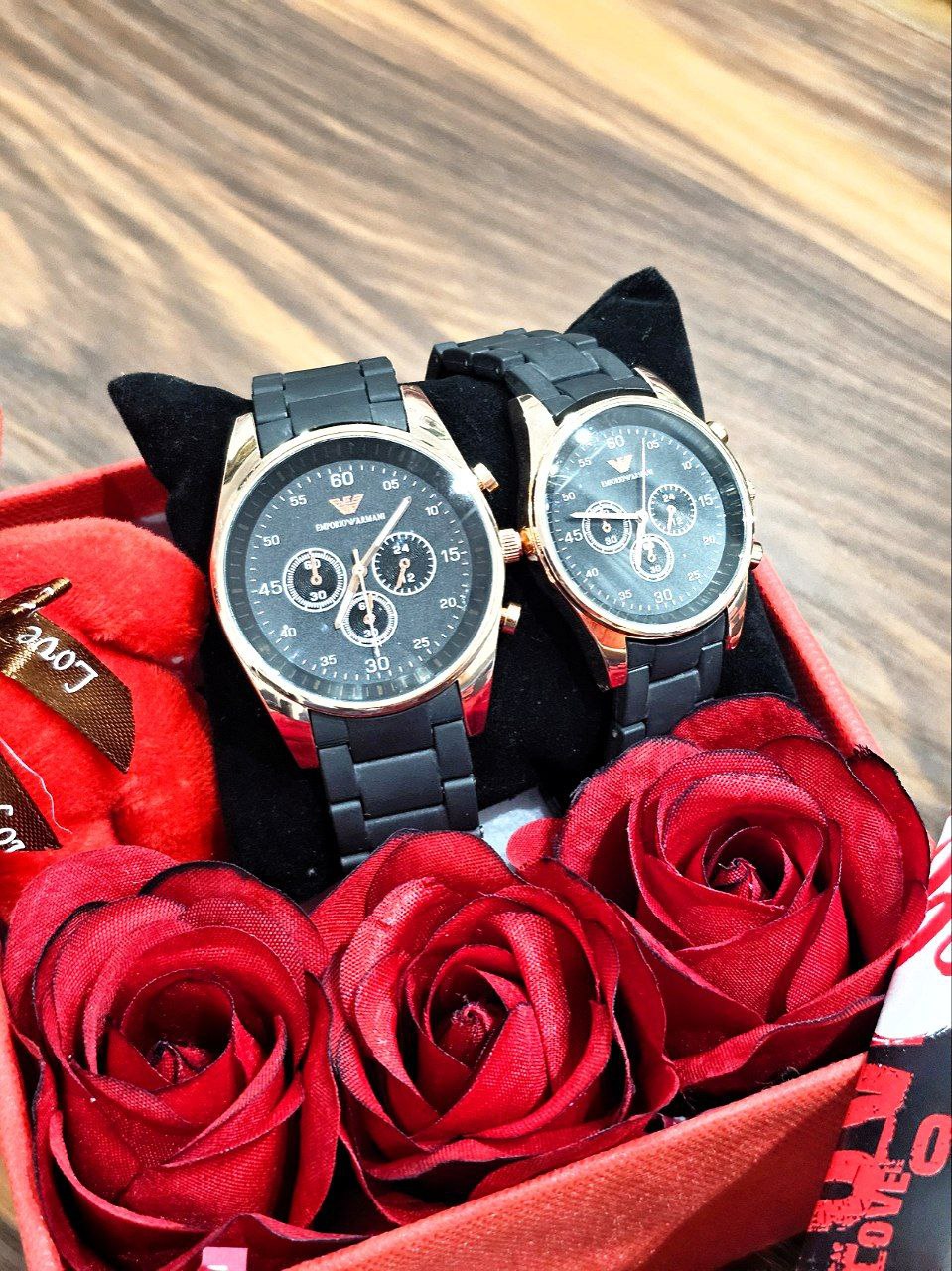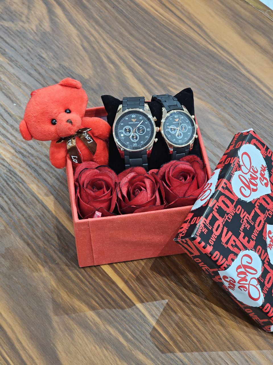 باکس هدیه دو عدد ساعت امپریو آرمانی بند فلزي با روکش سیلیکونی بهمراه جعبه و عروسک و گل