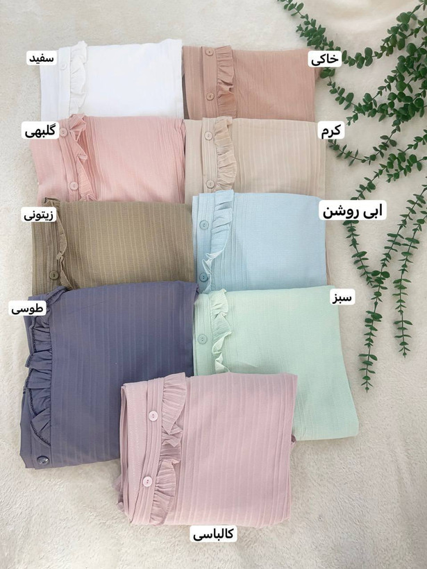 رنگ بندی : ابی تیره, ابی جدید, ابی روشن, ادامسی, زرشکی, سبز, سفید, طوسی تیره, طوسی روشن, کالباسی تیره, کالباسی روشن, کرم, نباتی, یاسی تیره, یاسی روشن