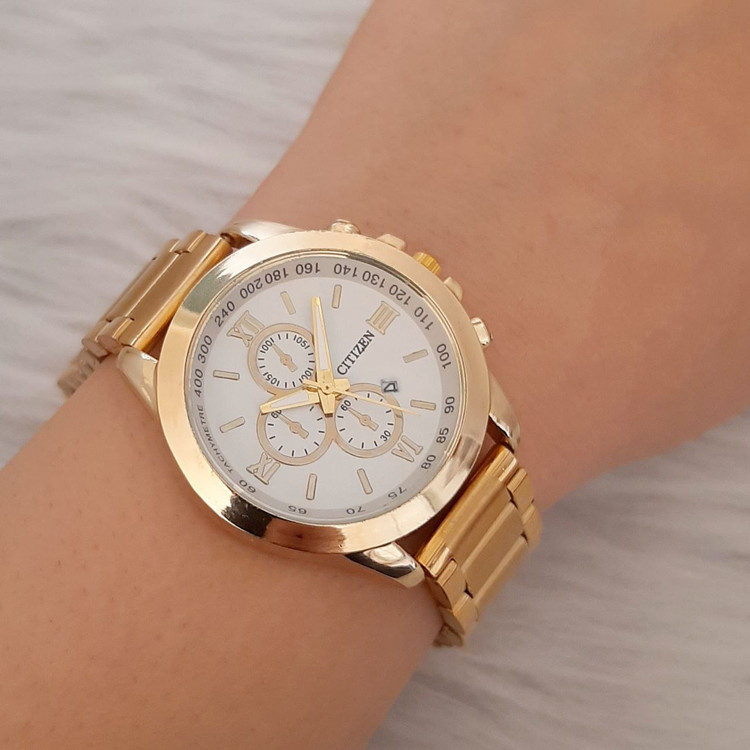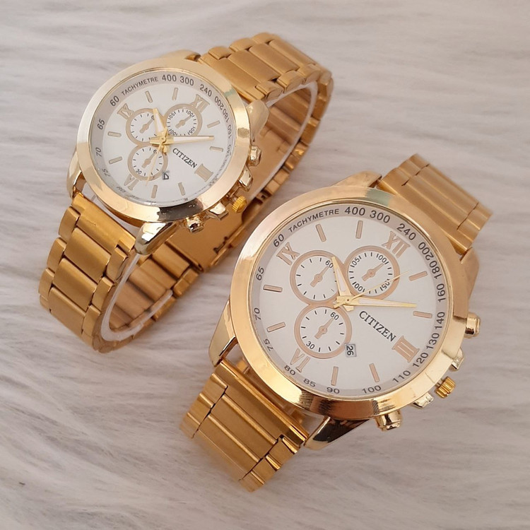 ست ساعت زنانه و مردانه مارک سیتیزن بنداستیل طلایی صفحه سفید. طرح سه موتوره