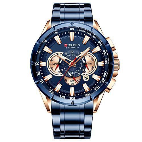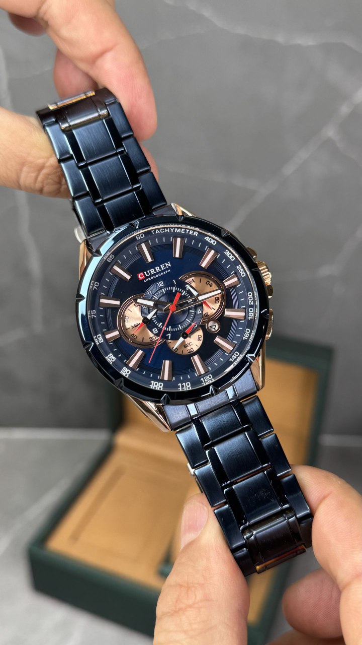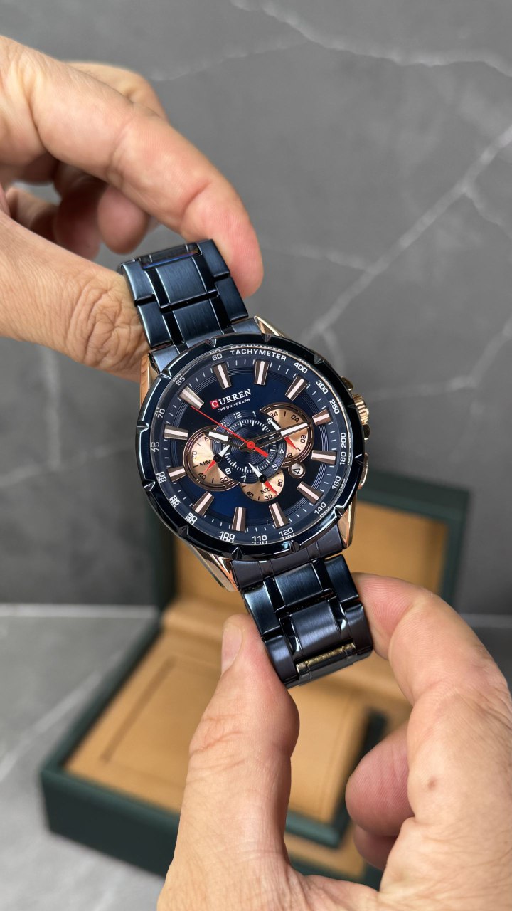 Curren 8363 سه موتوره فعال برند کارن اورجینال قطر 45 میلی متر رنگ ثابت ضدآب قاب استیل بند استیل شیشه ضدخش روز شمار دارد ضدآب 3ATM She