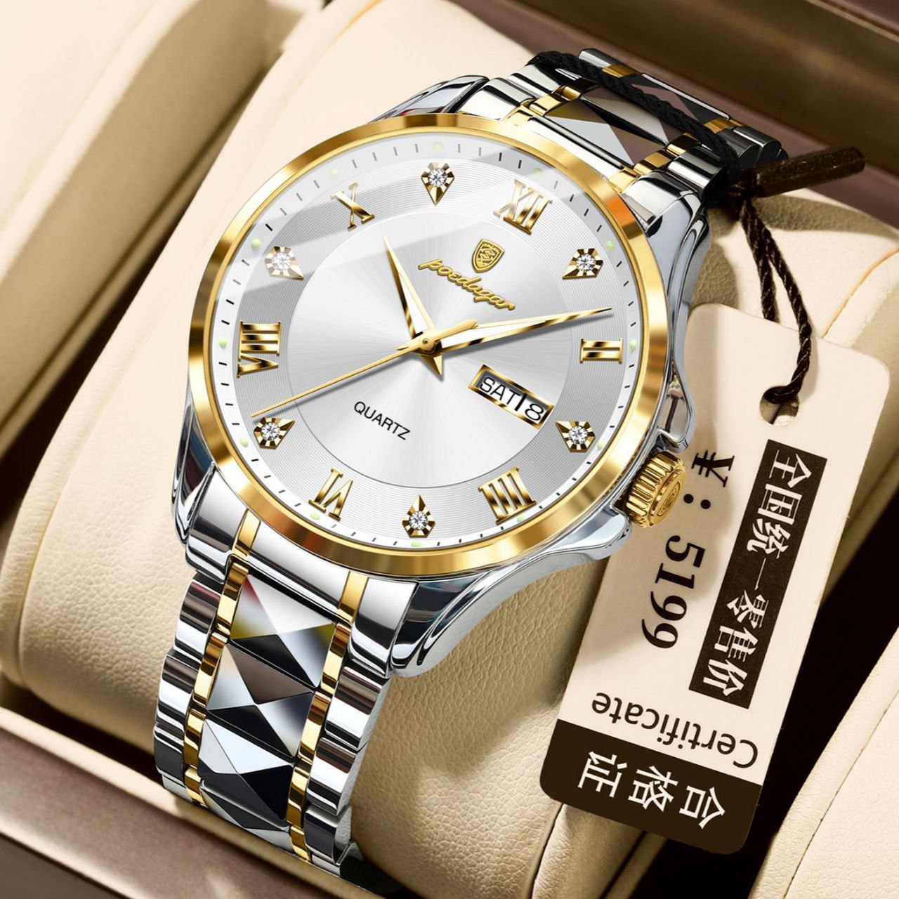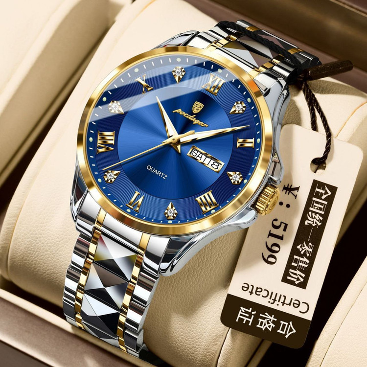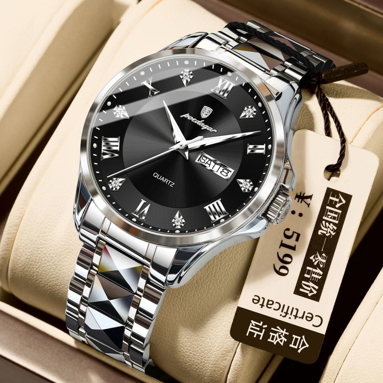 ساعت پوداگار الماسی مردانه دارای روز شمار ایام هفته صفحه شب نما برند شرکتی بند استیل قطر صفحه ۴۲ میل کریستال قاب یاقوت کبود ضدآب تا عمق بالا شیشه معدنی رنگ ثابت قفل سگک دوپروانه ای موتور کوارتز