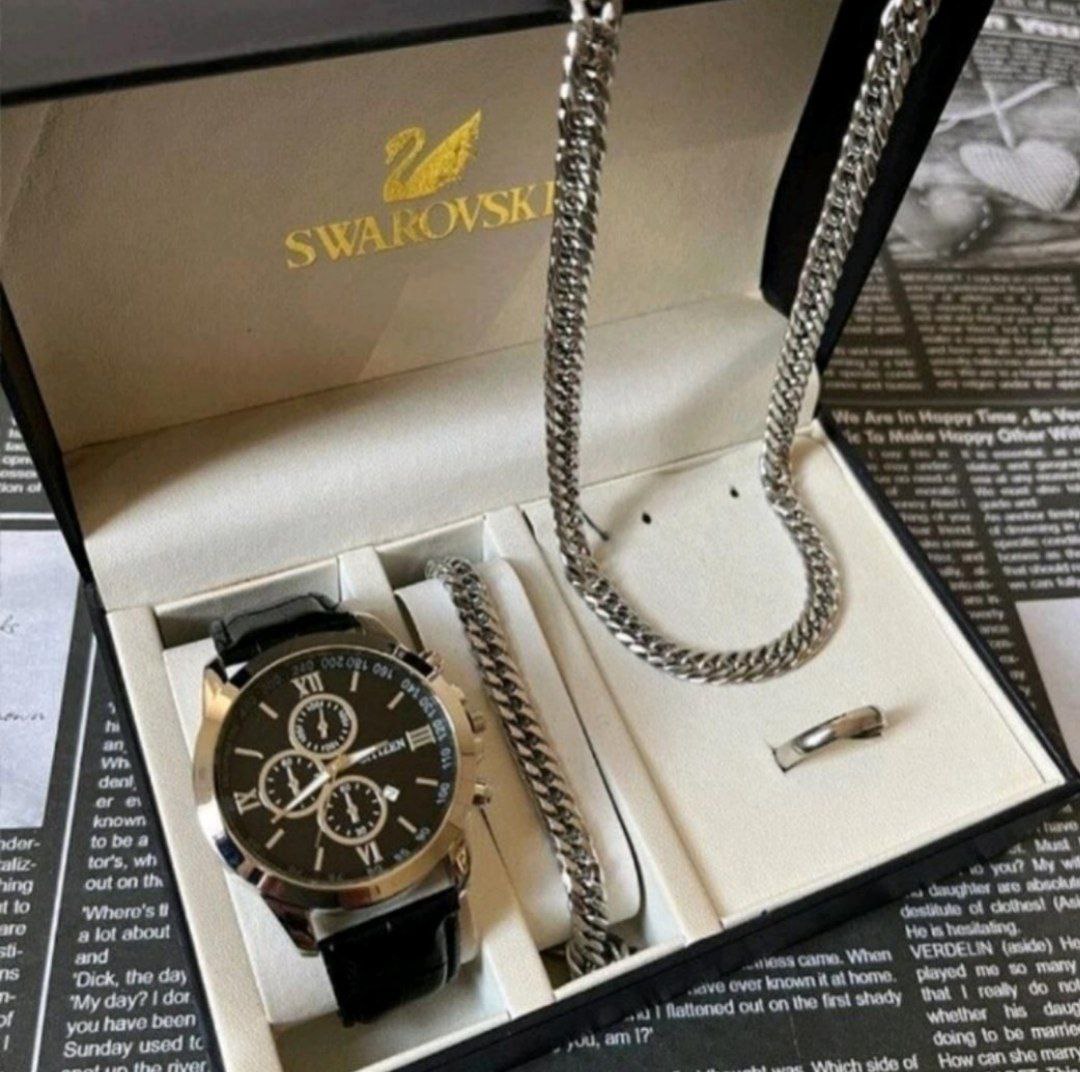 ست ساعت و دستبند و گردنبند کارتیر دارای روزشمار دستبند کارتیر استیل و حلقه استیل( سایز ۶ تا ۱۰) به همراه جعبه کادویی و باتری یدکی A.b