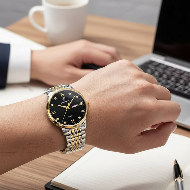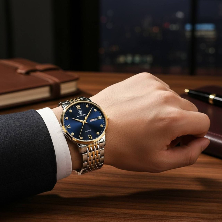 ساعت مردانه پر طرفدار از برند پوداگار❤️‍🔥 کار اورجینال از برند پوداگار📌 برند: poedagar مدل: 856 در دو رنگ صفحه مشکی و سورمه ای تاریخ دار(ایام هفته و ماه) تمام استیل بند سیلور طلایی موتور کوارتز قفل کلیپسی اعداد نگین دار قطر صفحه ۴۲ میل ضد اب (شست و شوی دست)