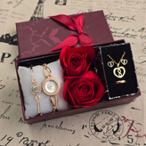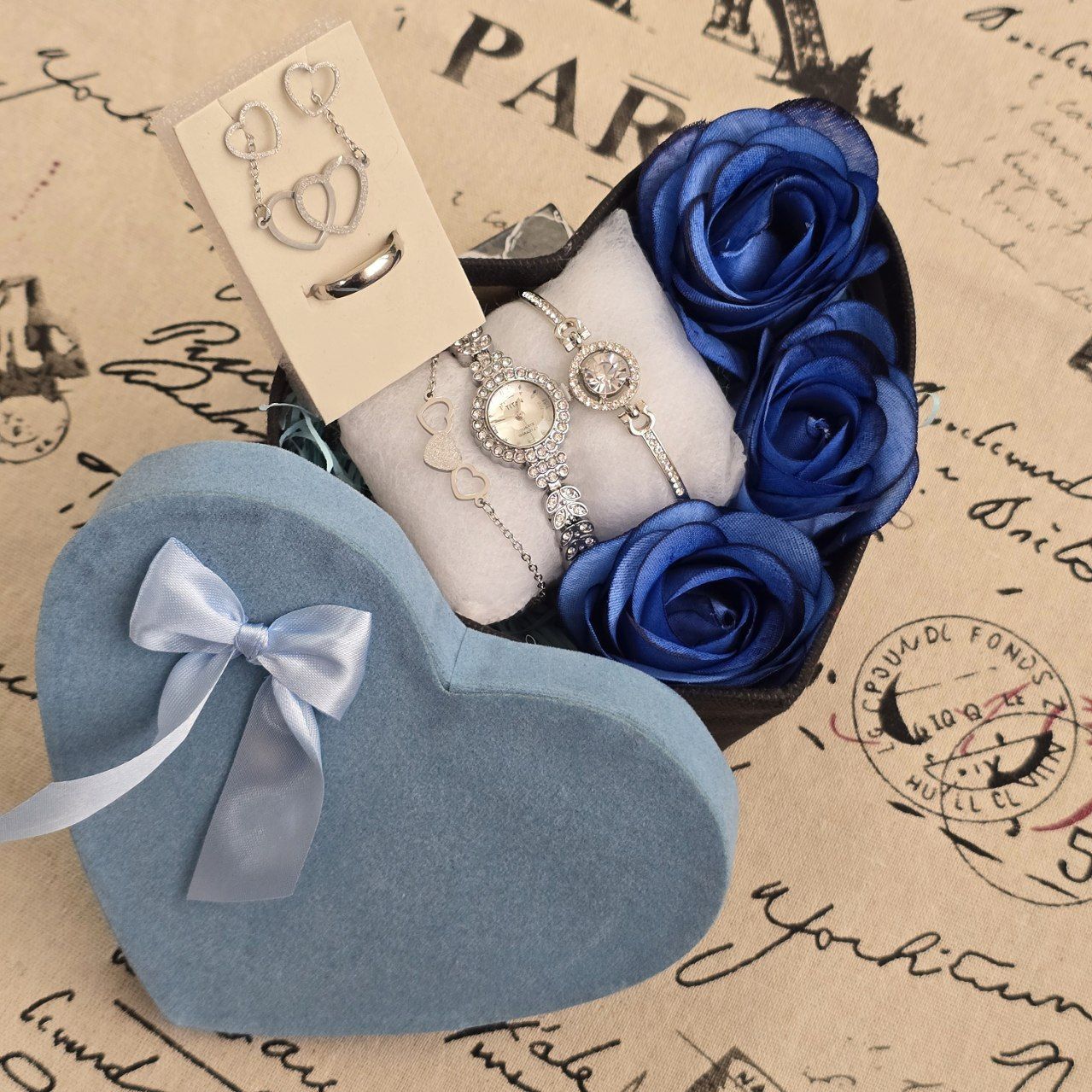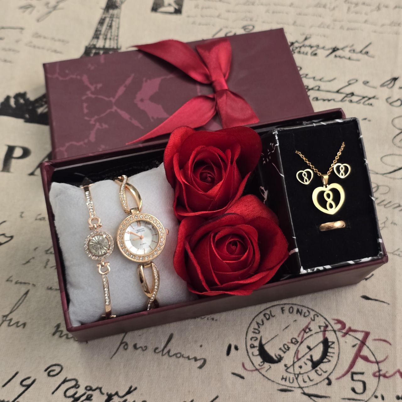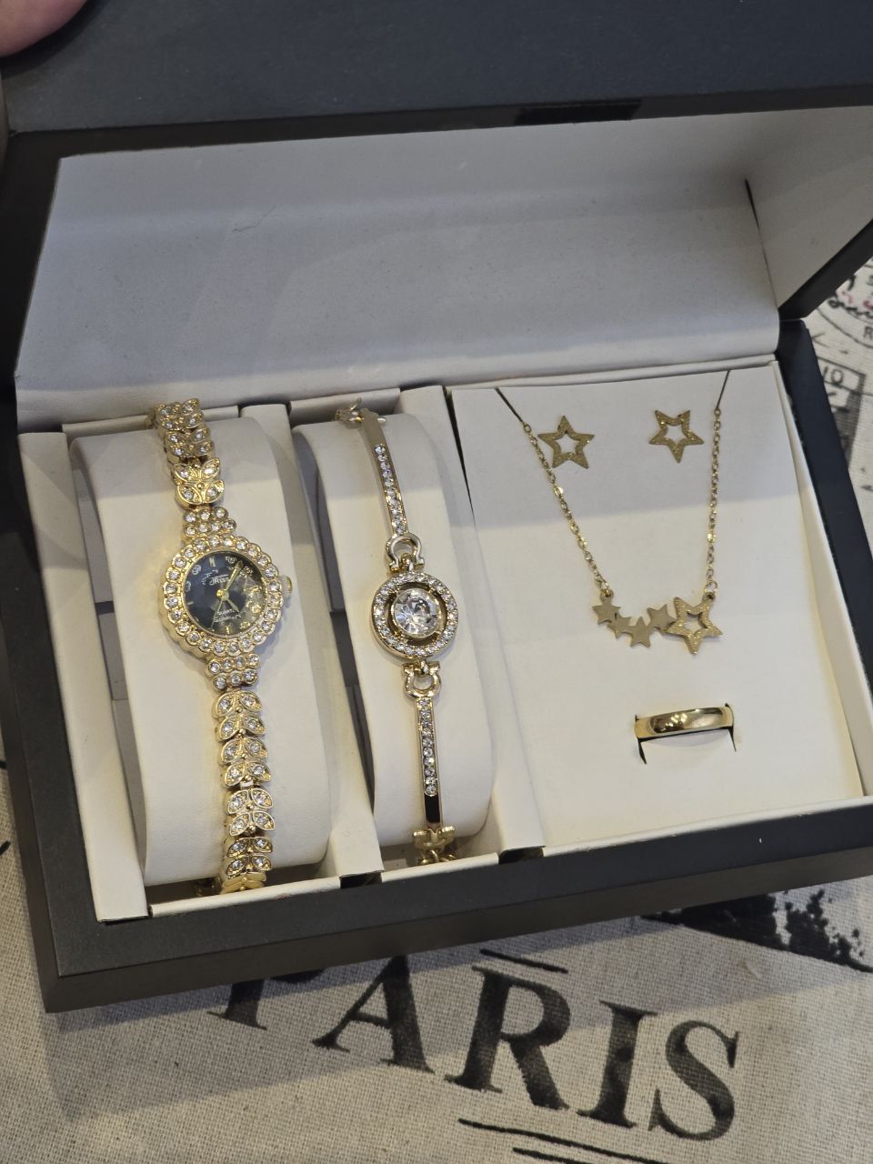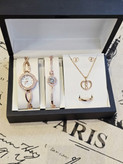 ست زنانه و دخترانه ساعت و دستبند و نیمست استیل و حلقه بهمراه جعبه کادویی و باتری یدکی
