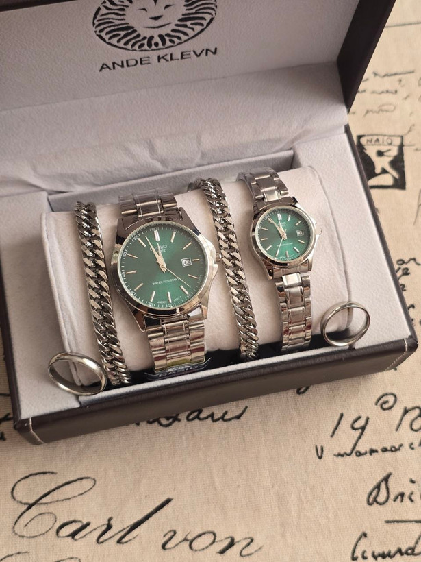 ست ساعت زنانه و مردانه برند Casio کاسیو ساعت ها دارای روزشمار دو عدد دستبند کارتیر استیل و دو تا انگشتر به همراه جعبه کادویی