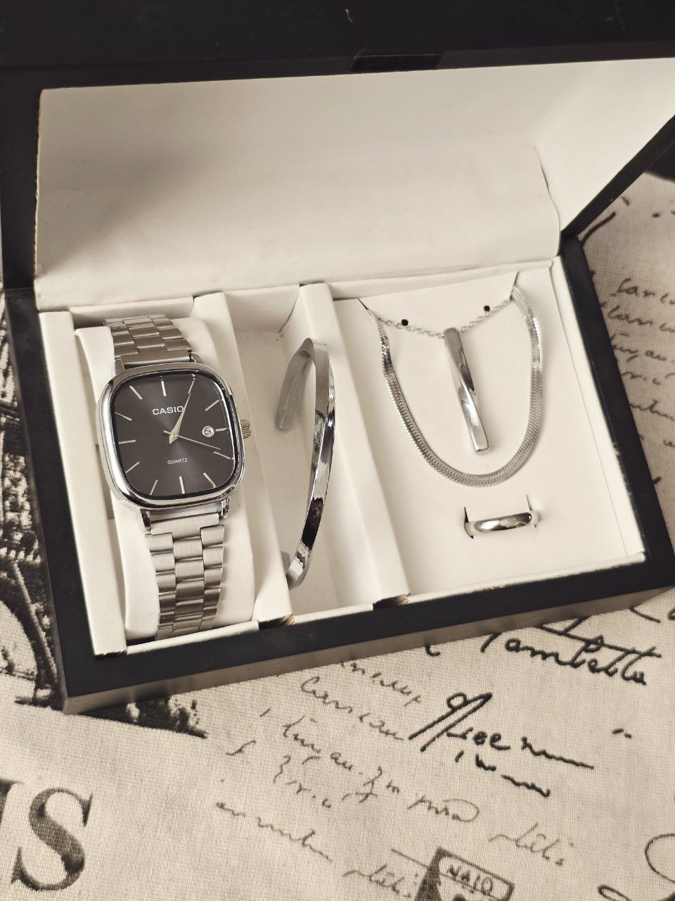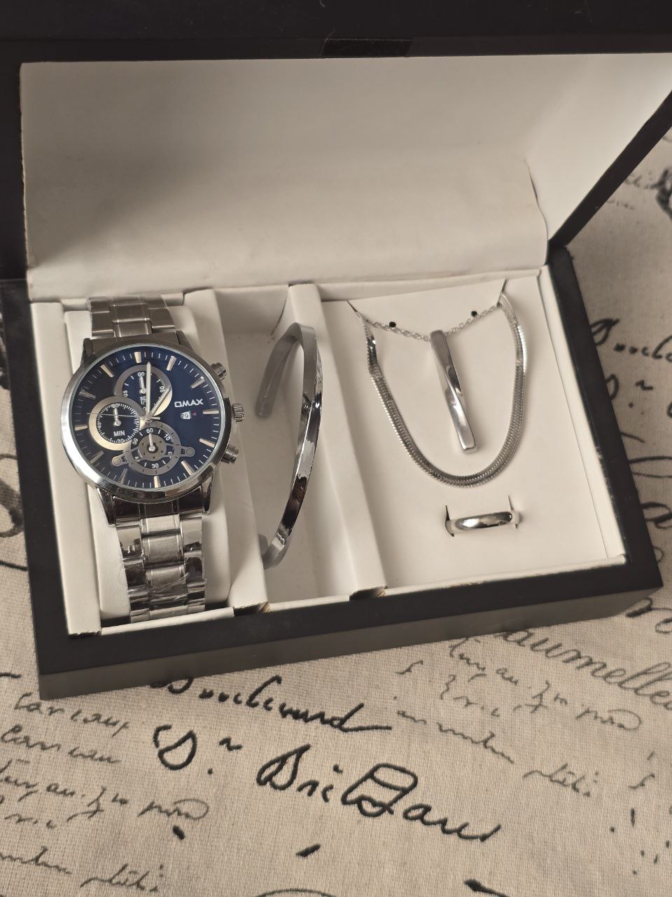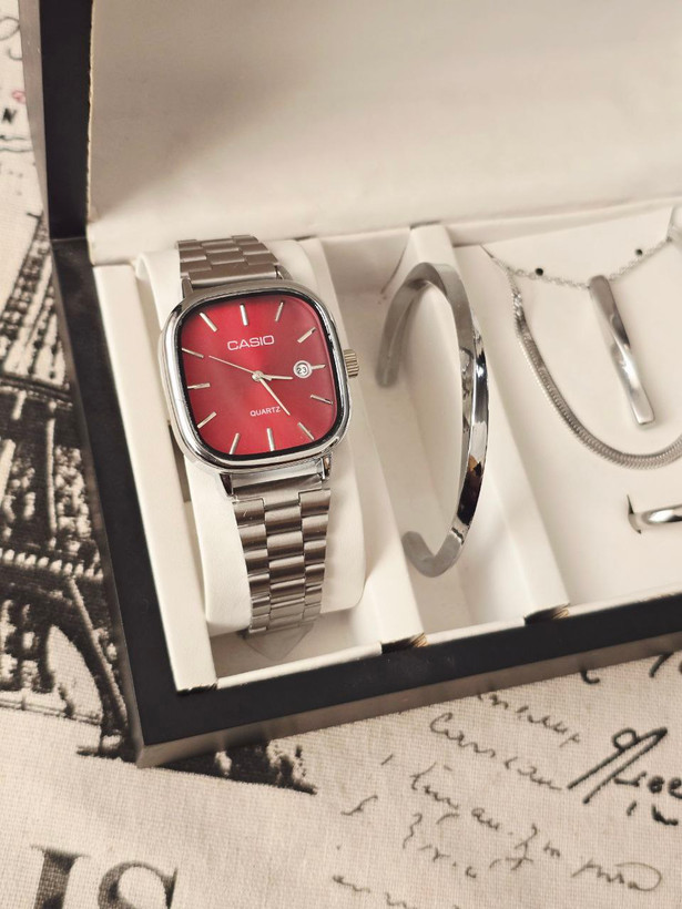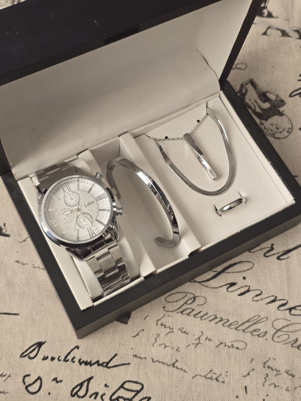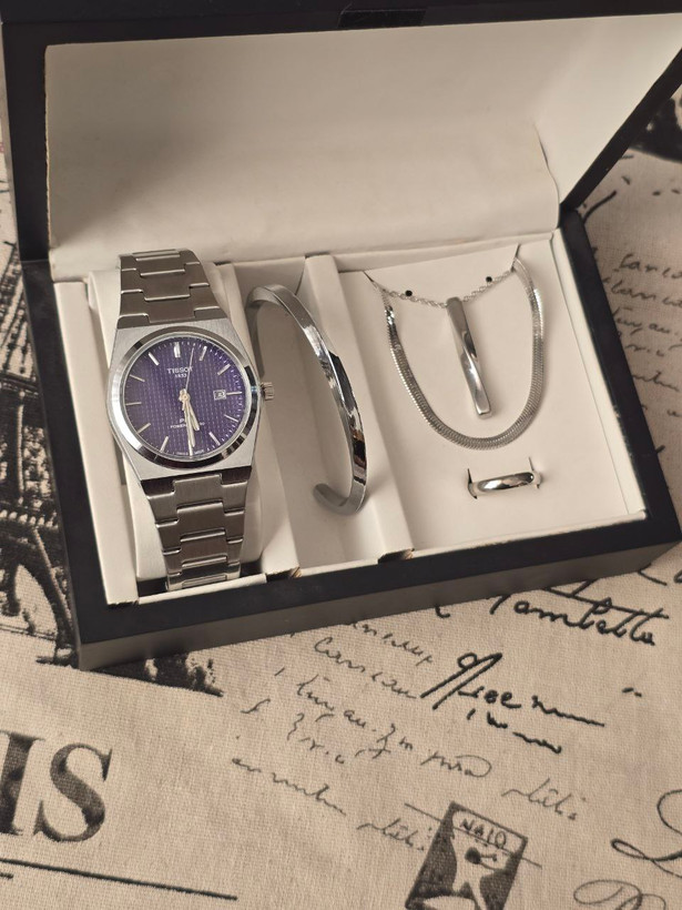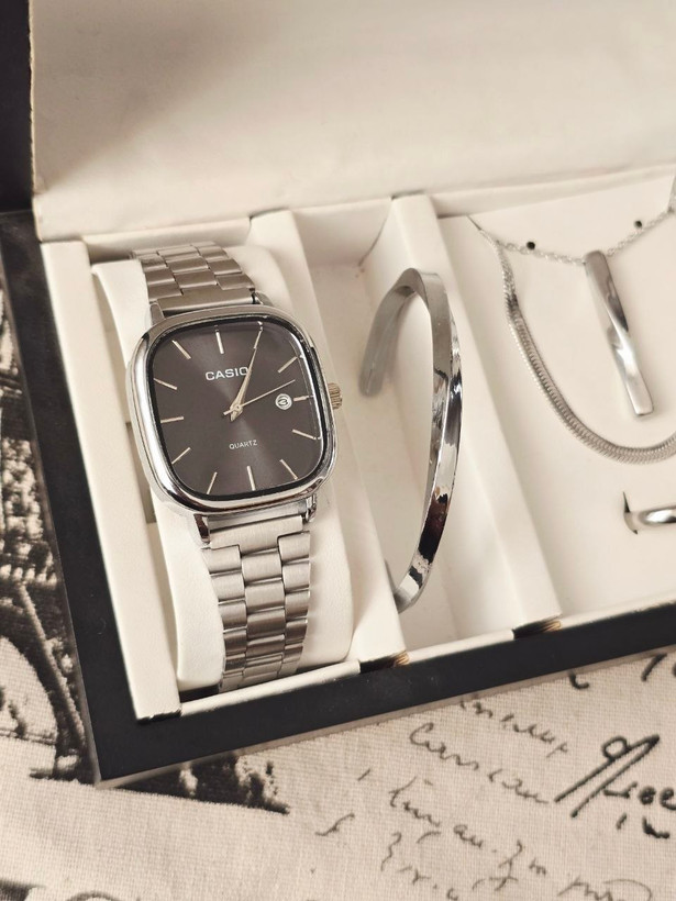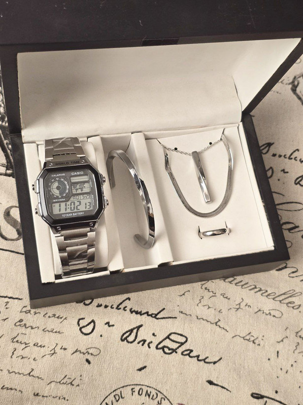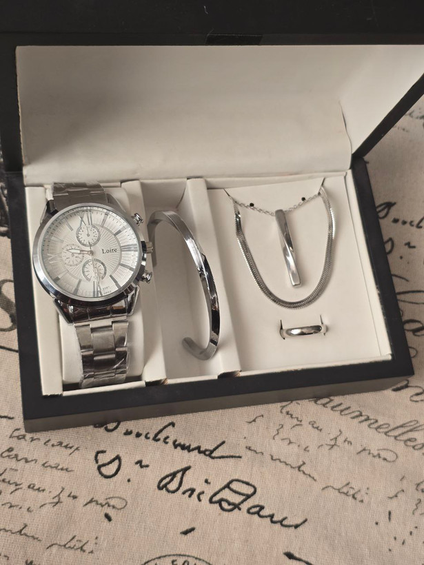 ست مردانه ساعت و دستبند گردنبند و حلقه بهمراه جعبه کادویی و باتری یدکی