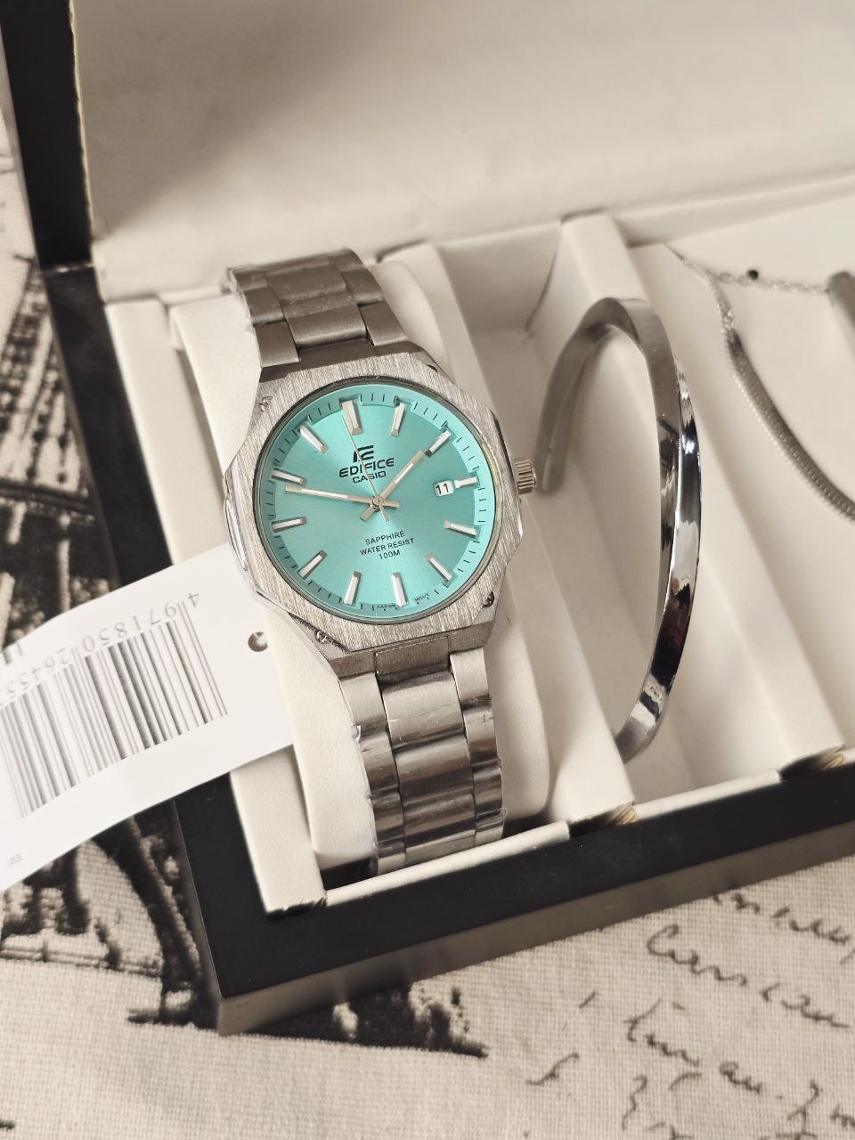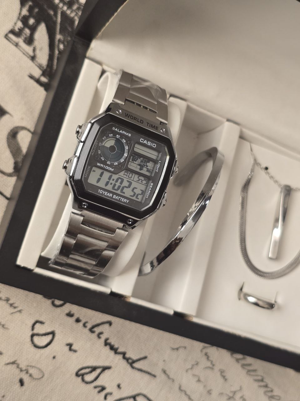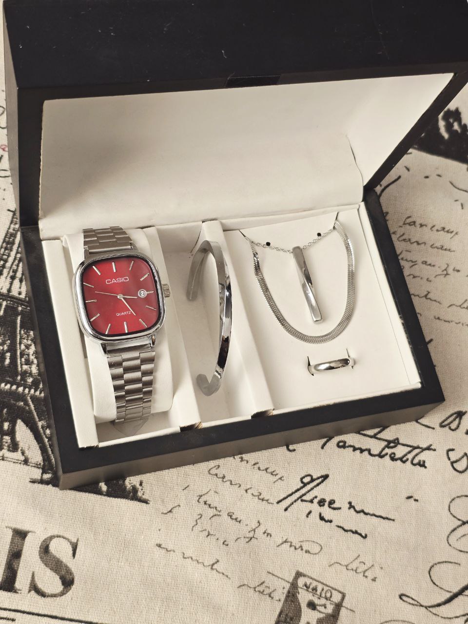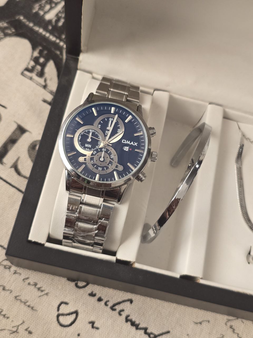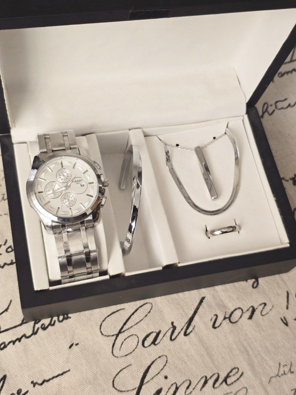 ست مردانه ساعت و دستبند گردنبند و حلقه بهمراه جعبه کادویی و باتری یدکی