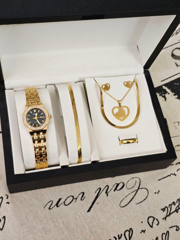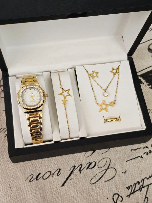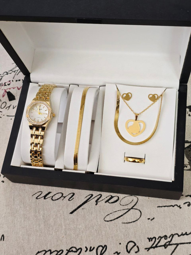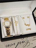 ست زنانه و دخترانه ساعت و زیورآلات استیل رنگ ثابت بهمراه جعبه کادویی و باتری یدکی