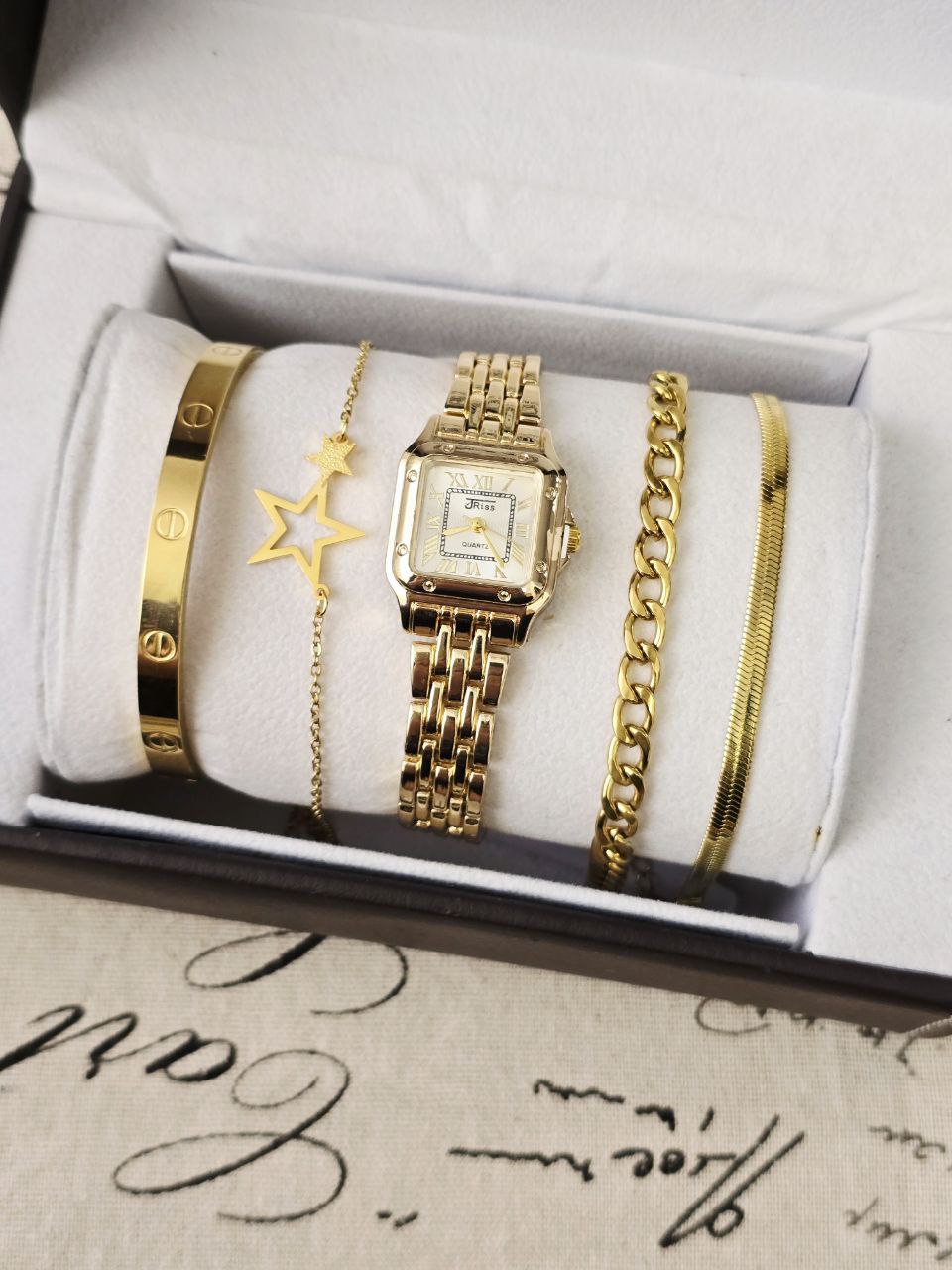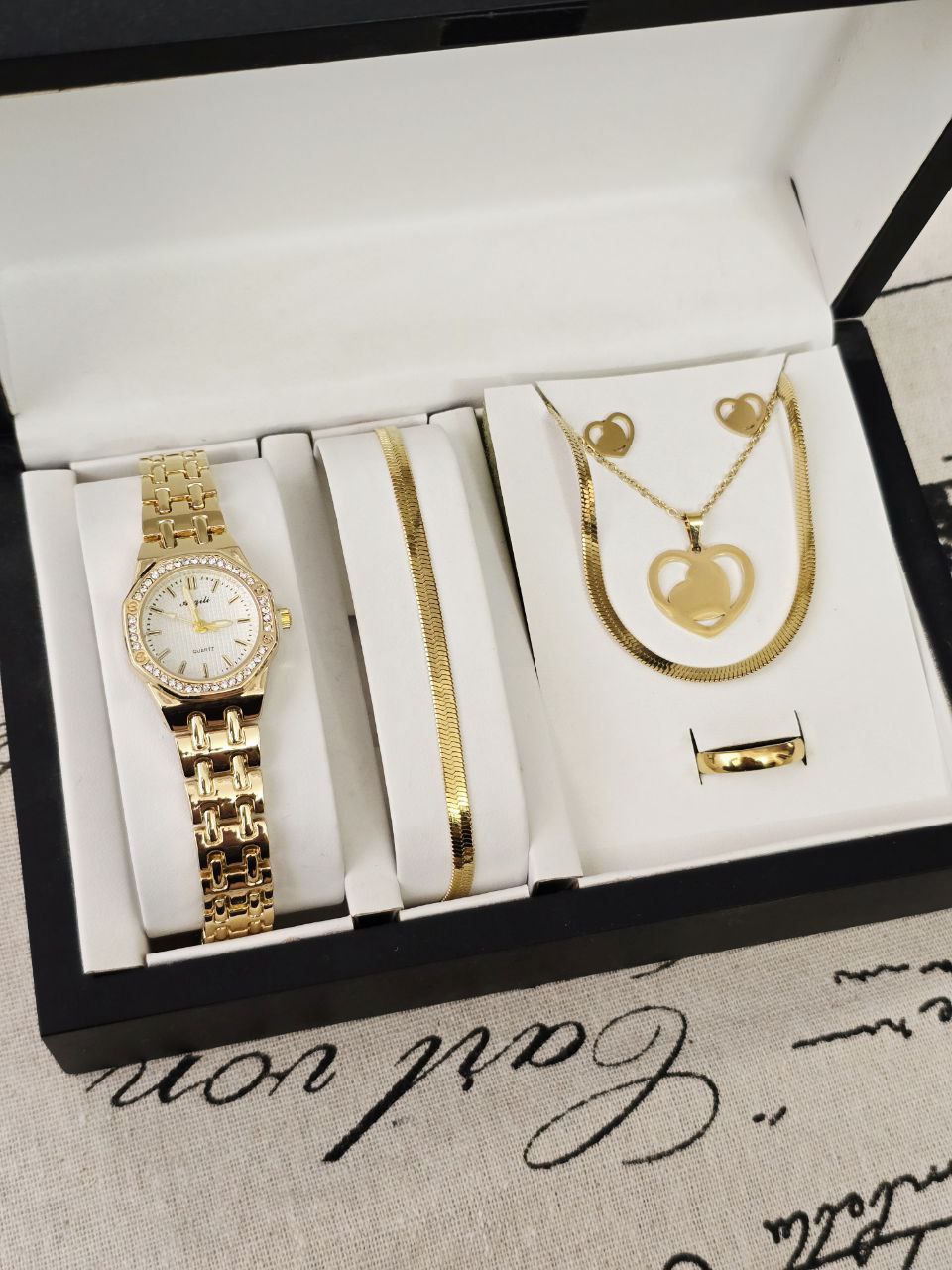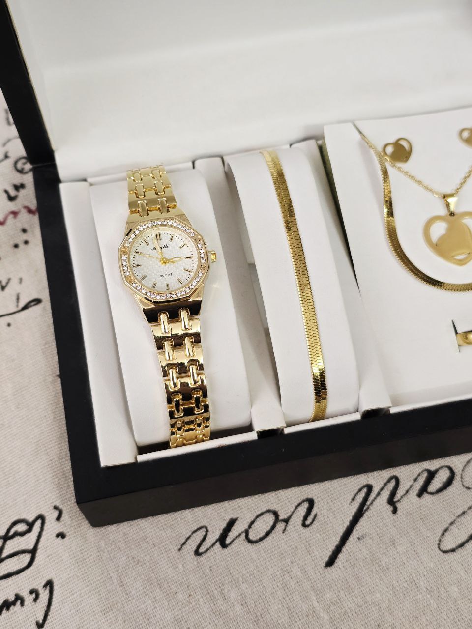 ست زنانه و دخترانه ساعت و زیورآلات استیل رنگ ثابت بهمراه جعبه کادویی و باتری یدکی