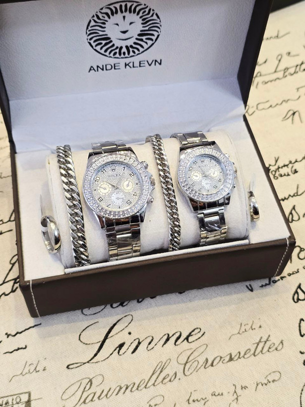 ست ساعت زنانه و مردانه ROLEX رولکس بهمراه دو عدد دستبند کارتیر استیل و دو تا انگشتر(سایز 6 تا 10) به همراه جعبه کادویی
