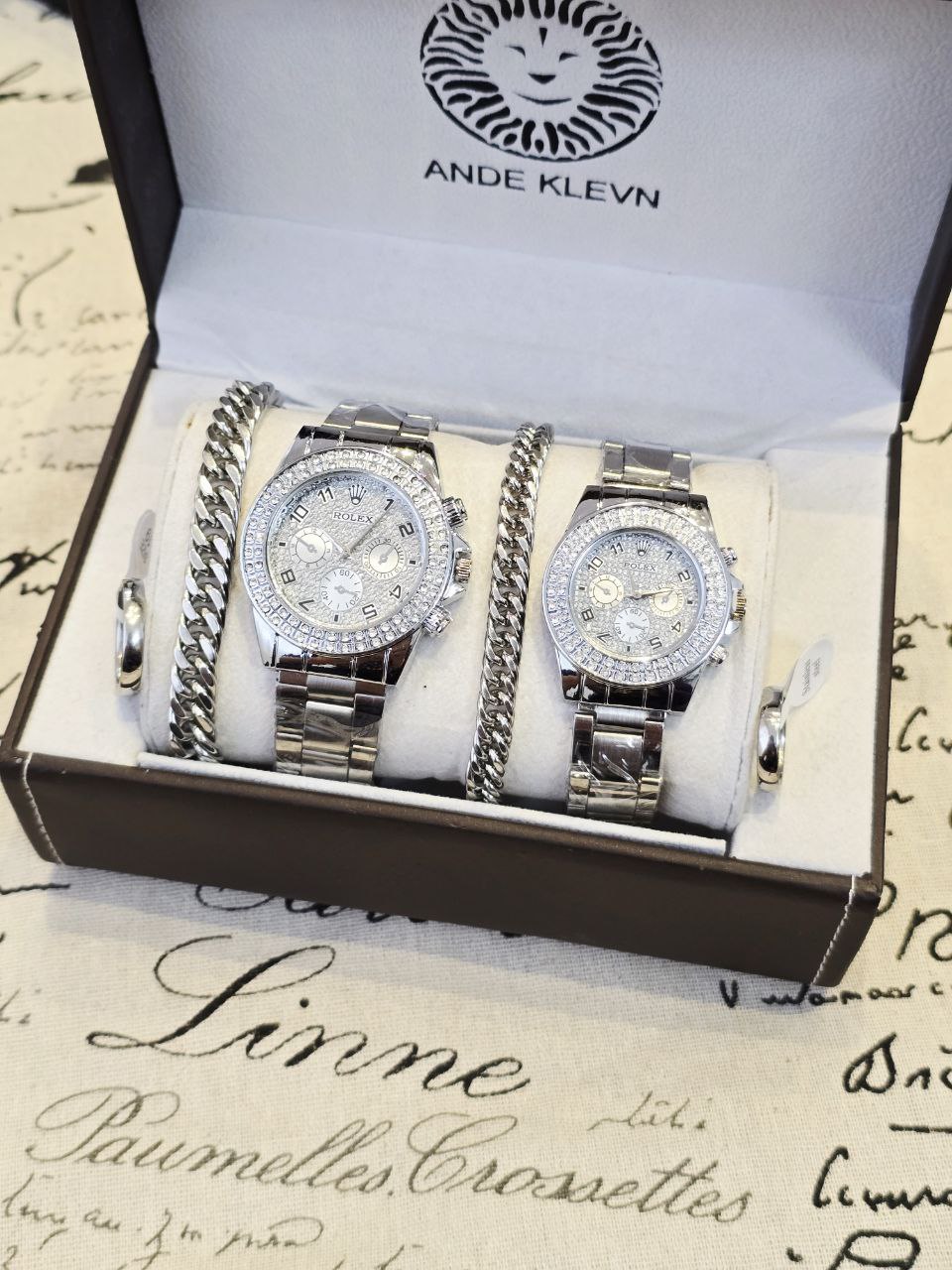 ست ساعت زنانه و مردانه ROLEX رولکس بهمراه دو عدد دستبند کارتیر استیل و دو تا انگشتر(سایز 6 تا 10) به همراه جعبه کادویی