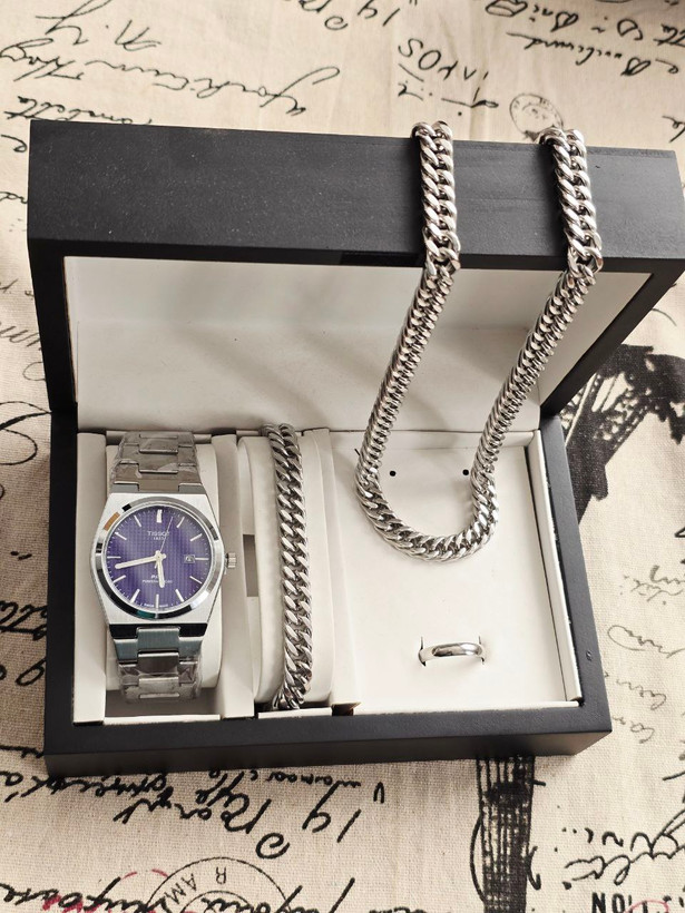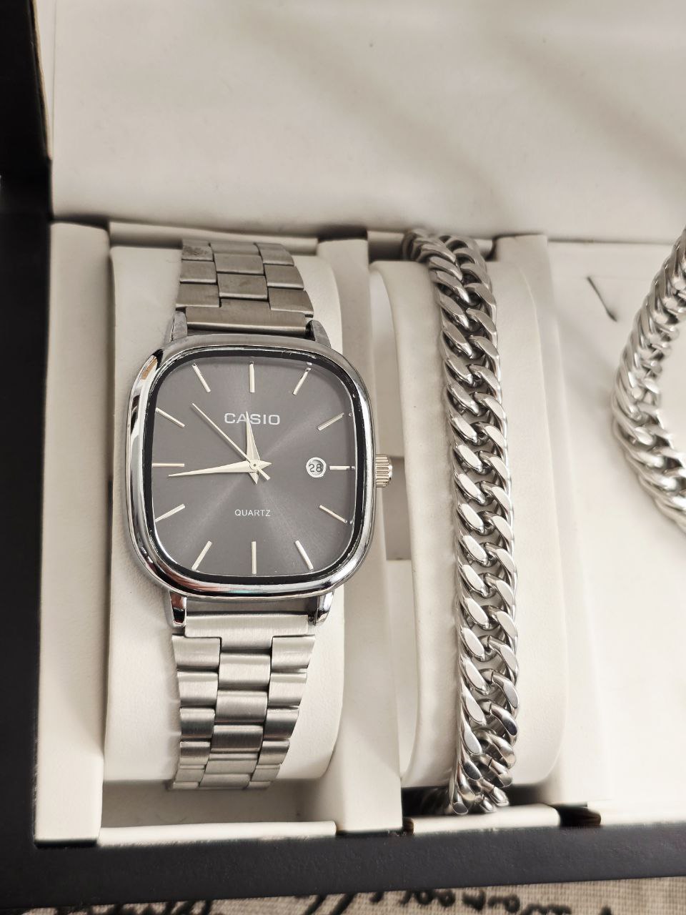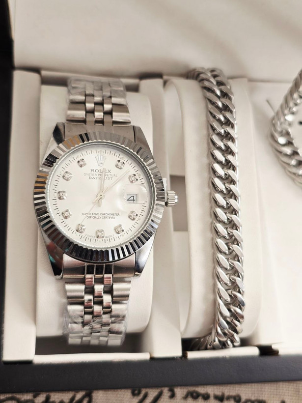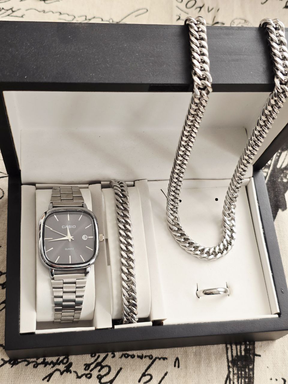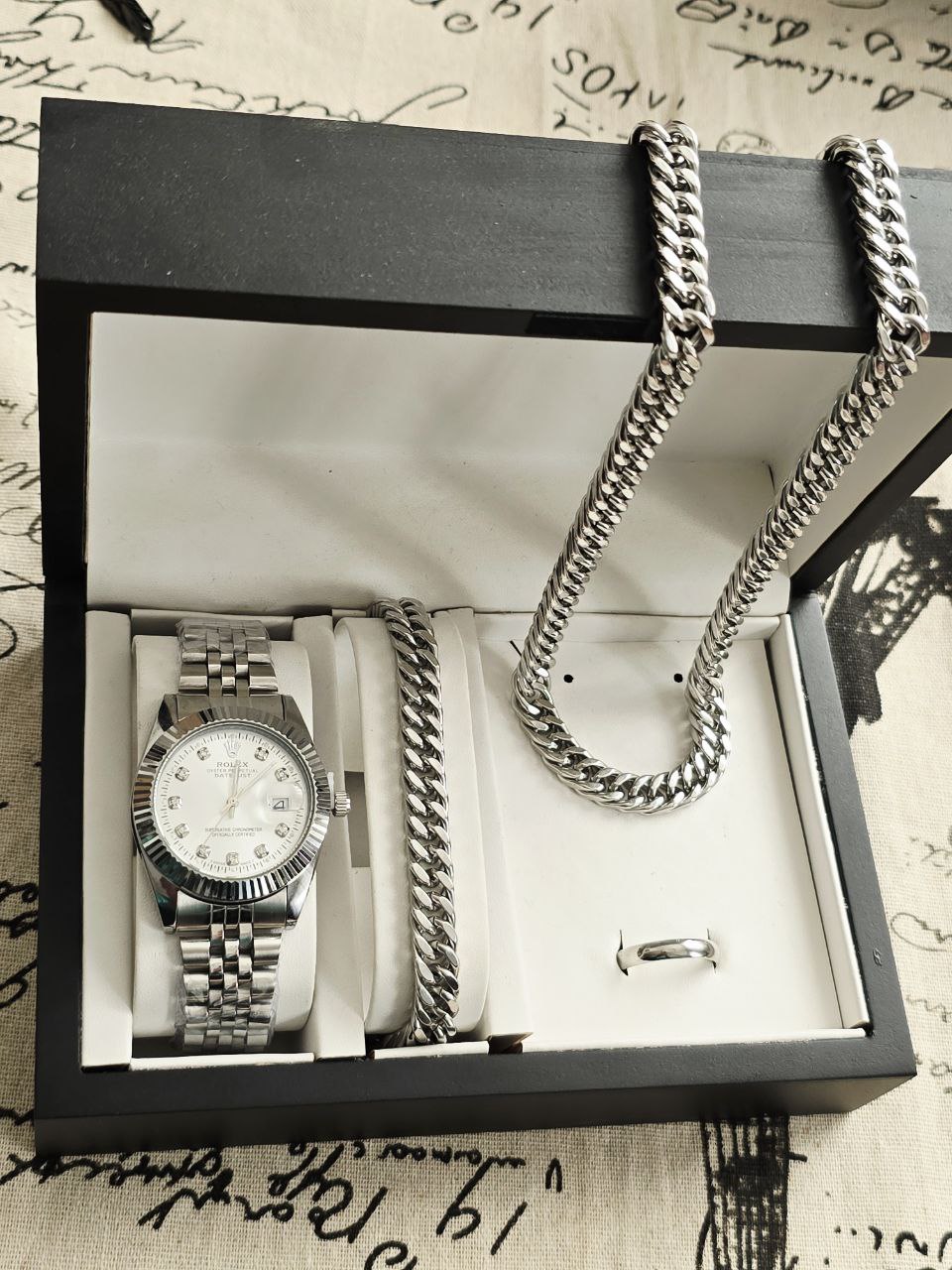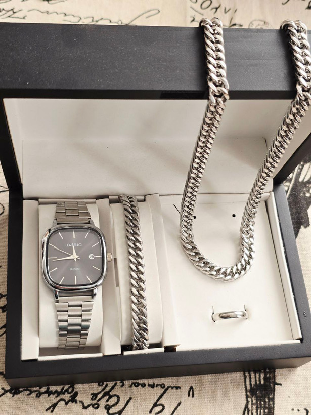 ست مردانه ساعت رولکس Rolex و کاسیو تقویم فعال و دستبند و گردنبند زنجیر استیل و حلقه استیل بهمراه جعبه کادویی
