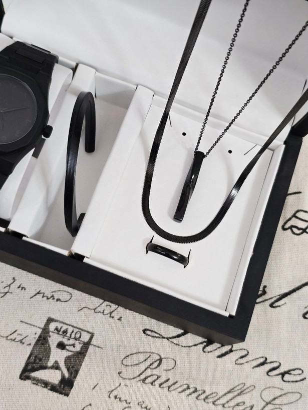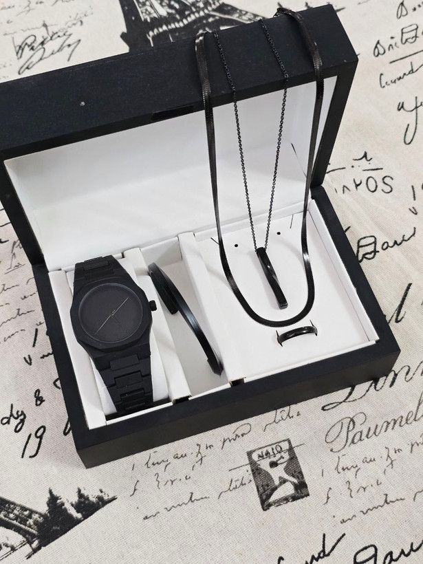 ست مردانه ساعت سیلیکنی مشکی طرح AP و بنگل و گردنبند و حلقه بهمراه جعبه کادویی و باتری یدکی