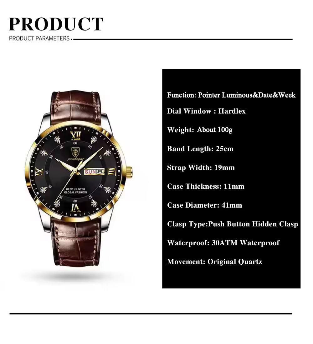 مشخصات: مردانه پر طرفدار از برند پوداگار❤️🔥 برند: poedagar مدل: 836 در دو رنگ صفحه مشکی و سورمه ای تاریخ دار(ایام هفته و ماه) قاب استیل بند چرمی قهوه ای موتور کوارتز قفل سگکی اعداد نگین دار قطر صفحه ۴۲ میل ضد اب (شست و شوی دست)