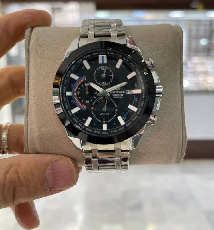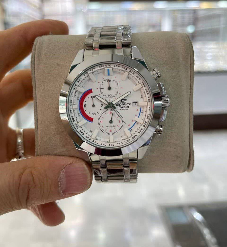 مشخصات: casio edifice ساعت مردانه سه موتور فعال موتور ضداب گرید A++ دارای روزشمار قاب دوار شیشهای در قاب پشت ساعت پیچ تنظیم قفلی بند و قفل استیل رنگ ثابت شیشه کریستال ضدخش