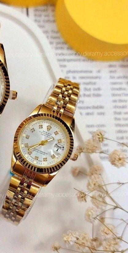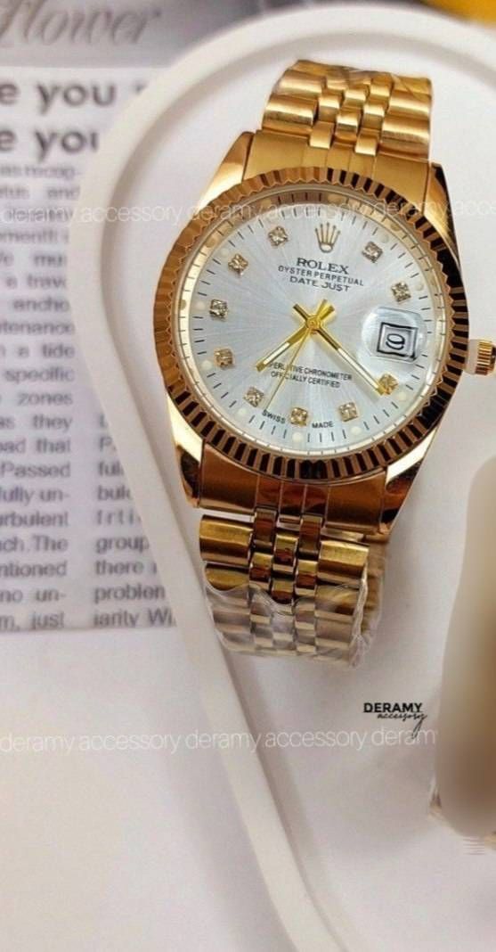 ساعت مچی مارک رولکس زنانه یا مردانه بصورت تک 👗بنداستیل طلایی صفحه سفید شیشه ذره بینی کیفیت عالی. تقویم دار. دارای جعبه کادویی بالشتک دار قطر صفحه مردانه ۳ سانت قطر صفحه زنانه ۲ سانت تقریبا 👗لاکچری پسند 👗شیک و عالی مناسب استفاده روزمره 👗🌹❤️ 👗کار عالی 🤩 🧵جنس : بند استیل 🖌 رنگ بندی : زنانه - مردانه
