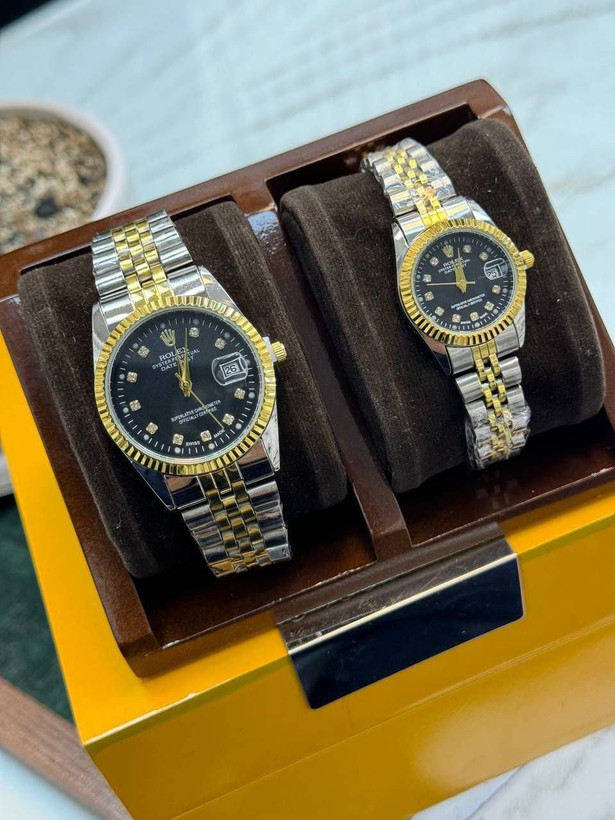 ست ساعت رولکس زنانه و مردانه باهم 👗👗بنداستیل دورنگ نقره ای طلایی صفحه مشکی. شیشه ذره بینی کیفیت عالی. تقویم دار. دارای جعبه کادویی بالشتک دار قطر صفحه مردانه 3 سانت قطر صفحه زنانه 2 سانت تقریبا 🧵جنس : بند استیل 🖌 رنگ بندی : ست آقا و خانم باهم - ⚜️ سایز ها : set -