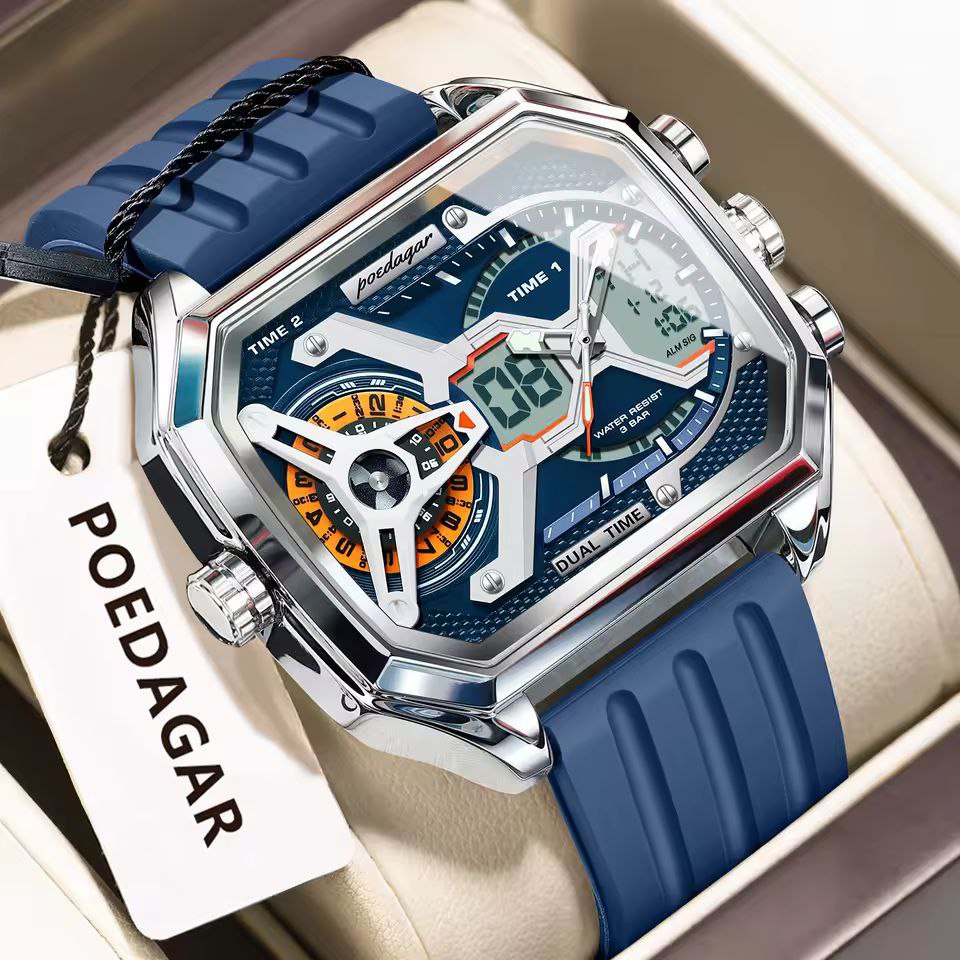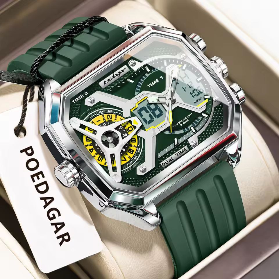 دستهبندی: ساعت مردانهبرچسبها : پرفروشترینمشخصات: ♻️ برند / poedagar ♻️ 3 زمانه ♻️ روز شمار دار ، ایام هفته ، آلارم ، بک لایت و... ♻️ بند سیلیکونی ♻️ قطر ۴۷ میلی متر