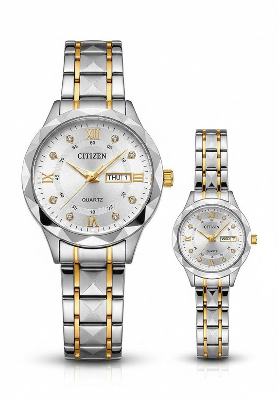 مشخصات: ☑️CITIZEN Couple watch ⌚️سی تیزن مدلی نو رفرانس4200GO دارای روز شمار و ایام هفته طرح الماس بند استیل مقاوم دربرابر آب