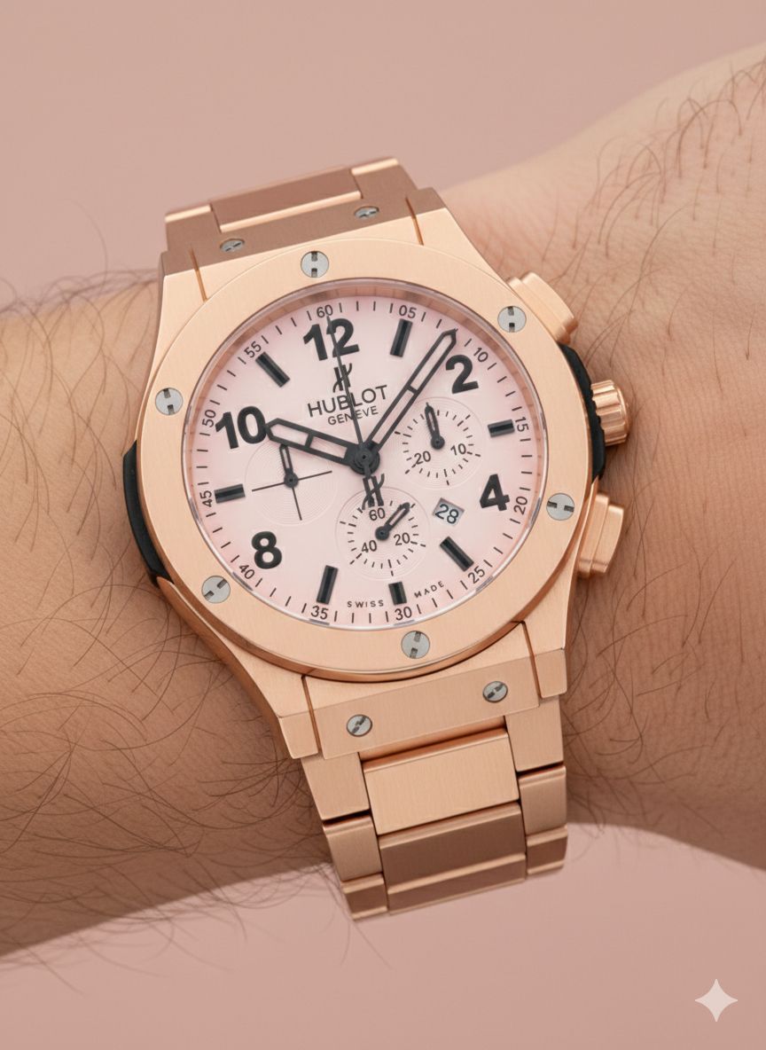 ساعت مچی مردانه کد 2301 مردانه فلزی برند هابلوت HUBLOT قفل پروانه ای باکیفیت طراحی خاص و زیبا بند فلزی سنگین صفحه رز گلد موتور کوارتز طرح سه موتوره دارای روز شمار