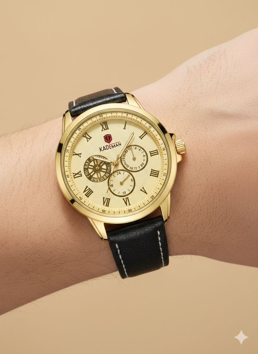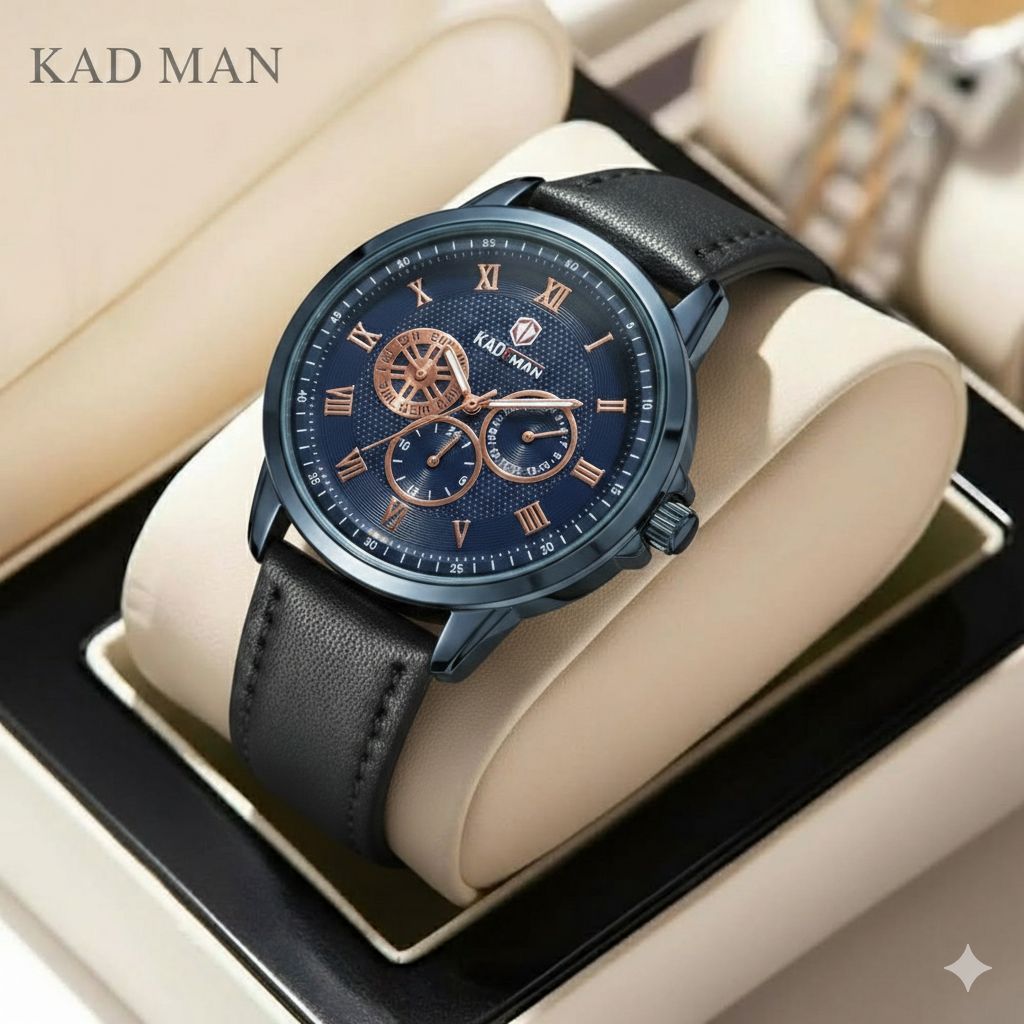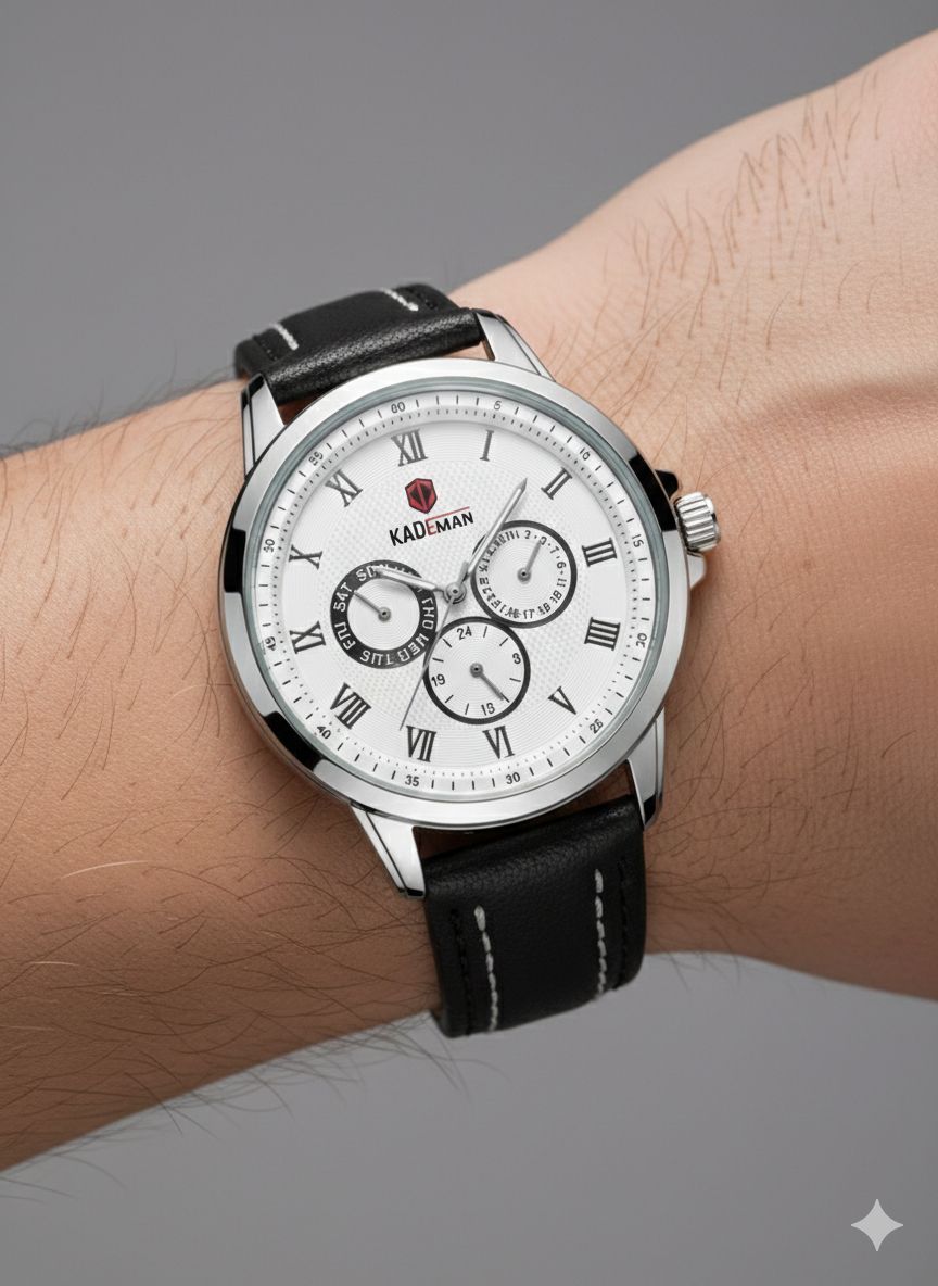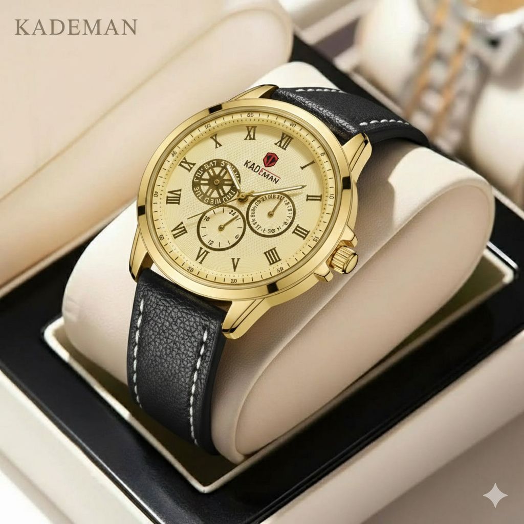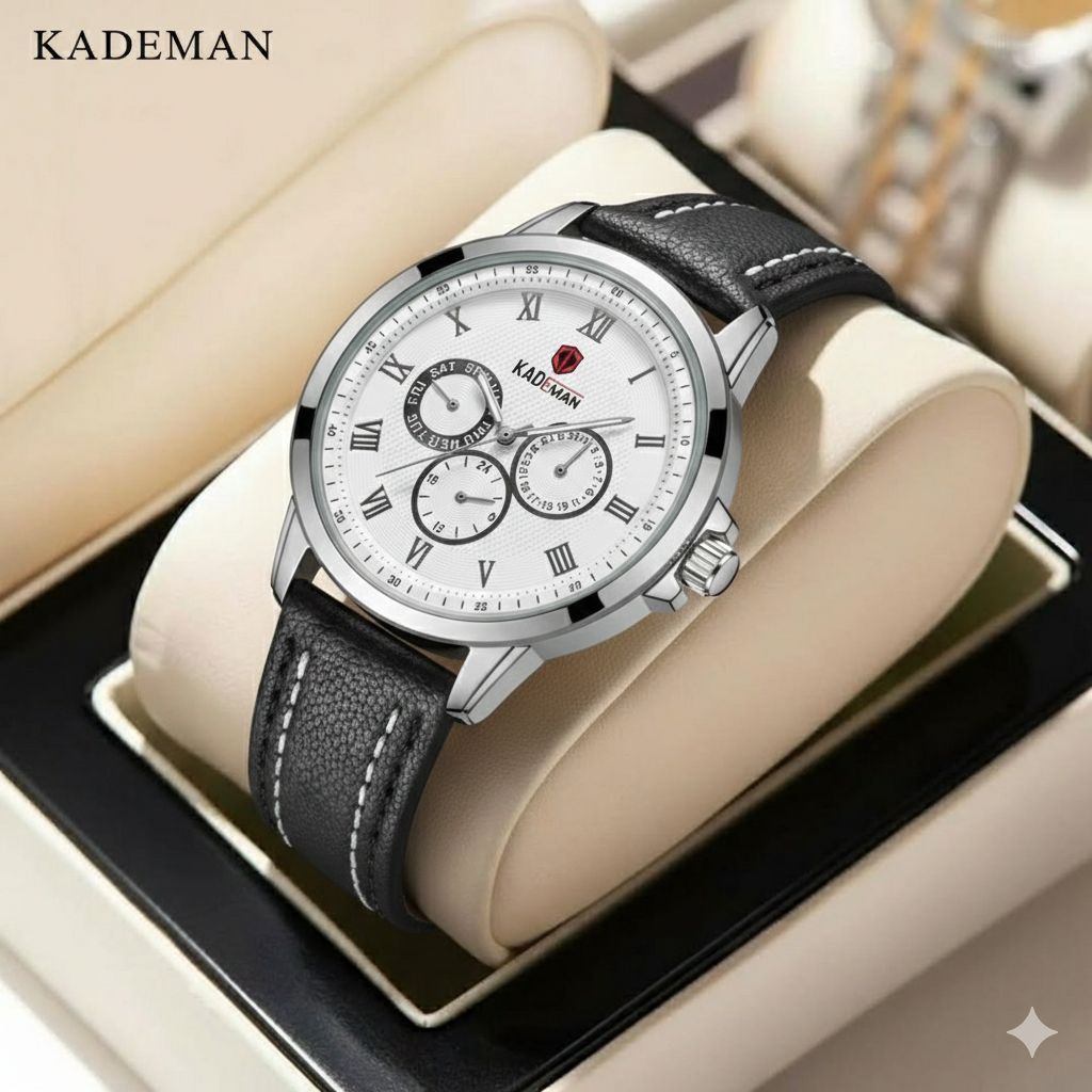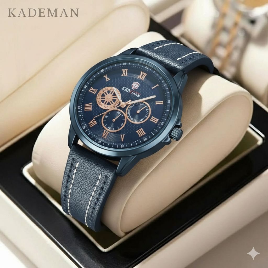 ساعت مچی مردانه کد 2270 مردانه برند KADEMAN نشانگر ۲۴ ساعته سه موتور فول تایم شمارش معکوس دارای روز شمار صفحه شب نما بندچرم اصل رنگ ثابت قفل کمربندی فولادی موتور کوارتز