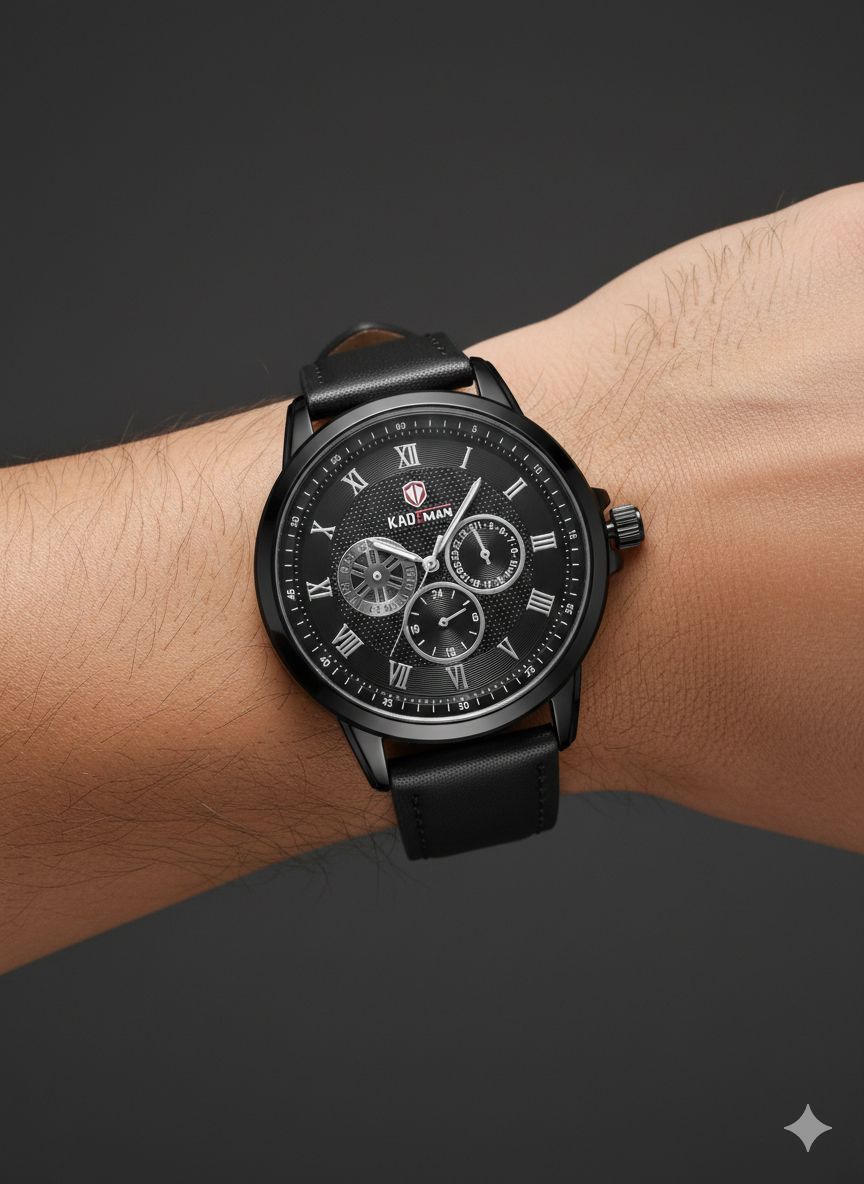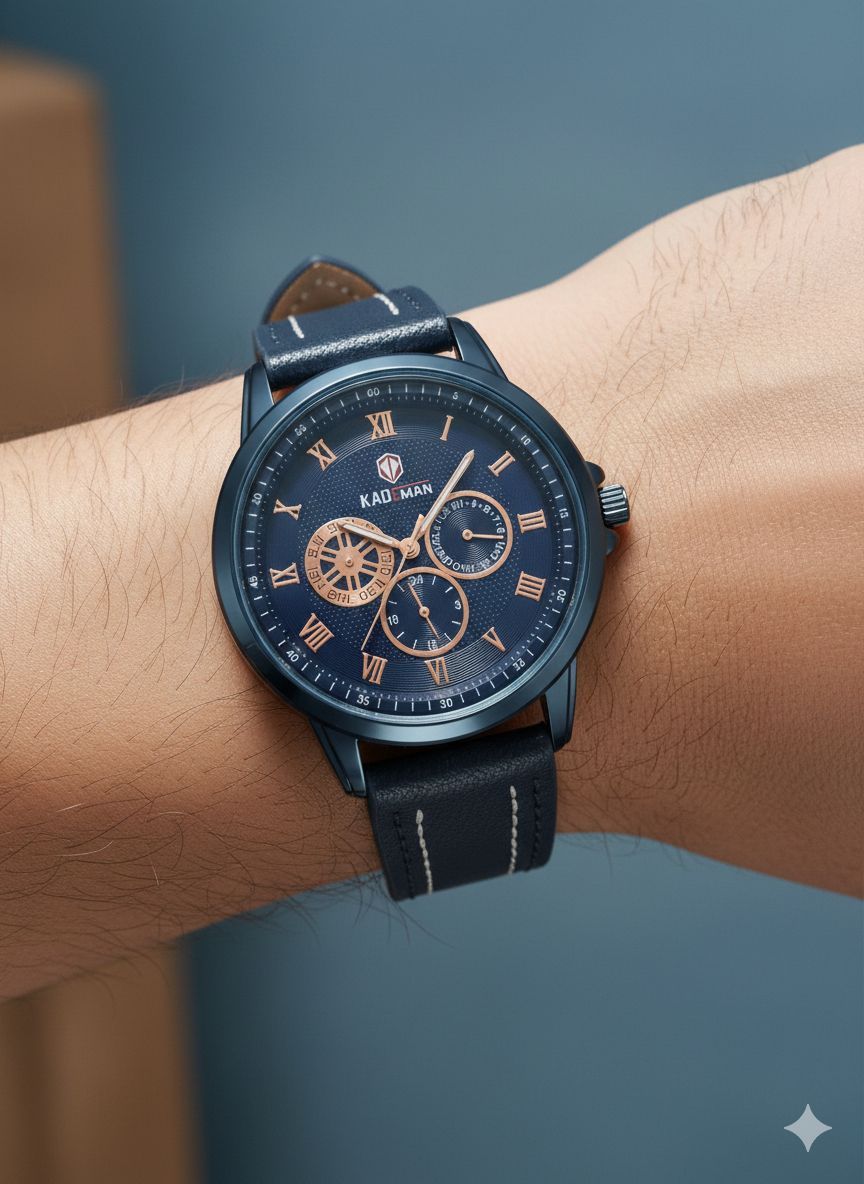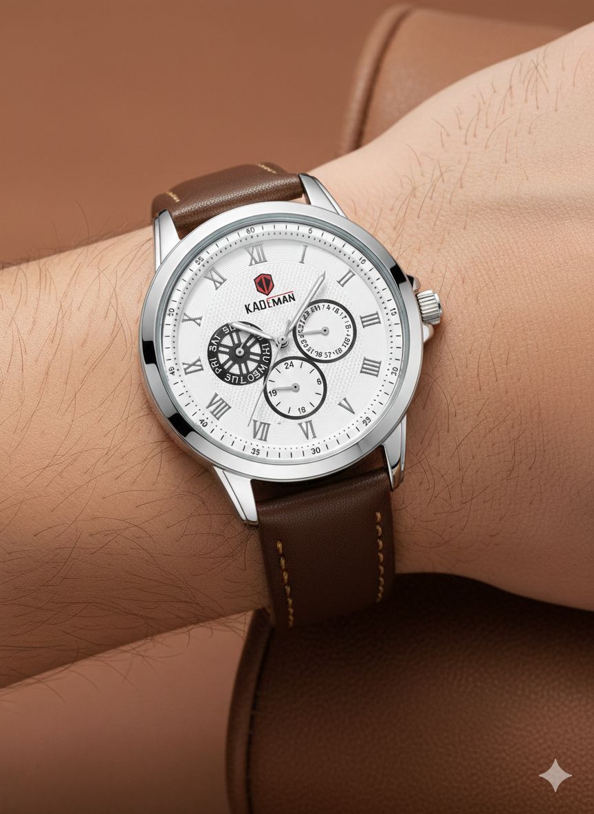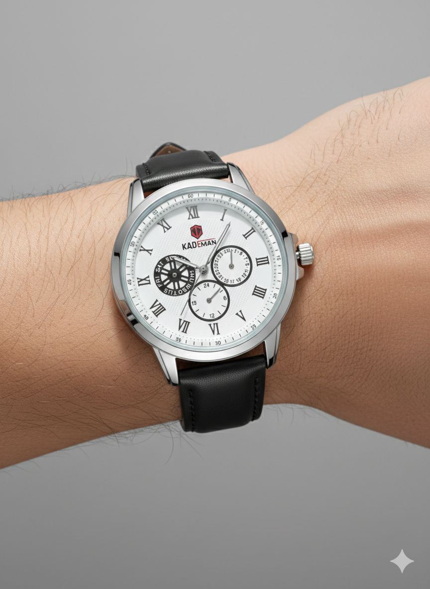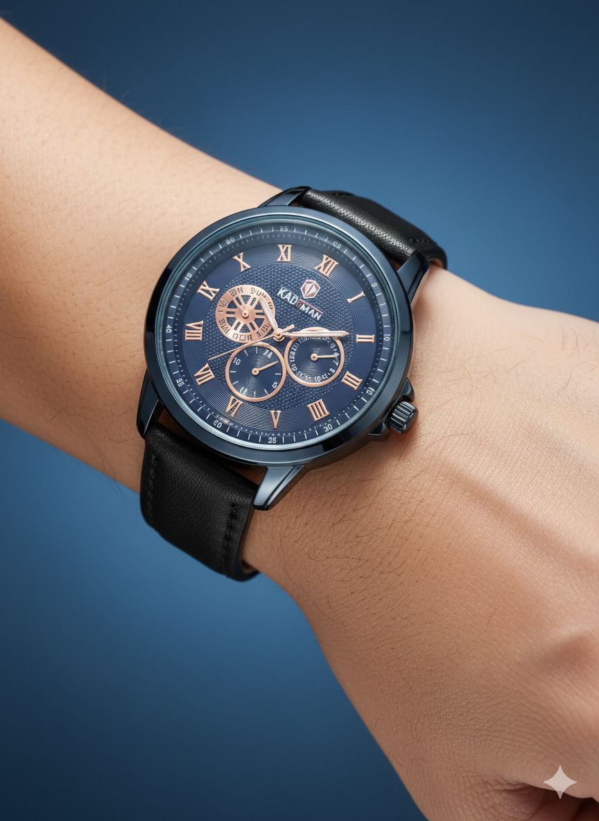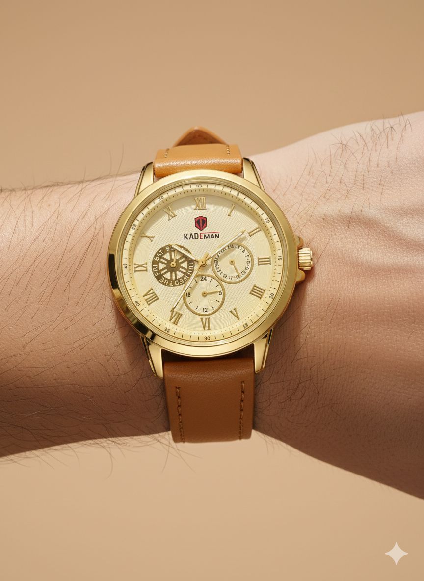 ساعت مچی مردانه کد 2270 مردانه برند KADEMAN نشانگر ۲۴ ساعته سه موتور فول تایم شمارش معکوس دارای روز شمار صفحه شب نما بندچرم اصل رنگ ثابت قفل کمربندی فولادی موتور کوارتز