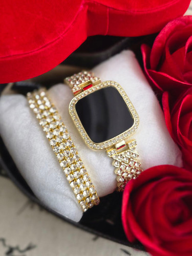 باکس هدیه زنانه و دخترانه ساعت دیجیتال LED لمسی و دستبند نگینی و باکس و گل