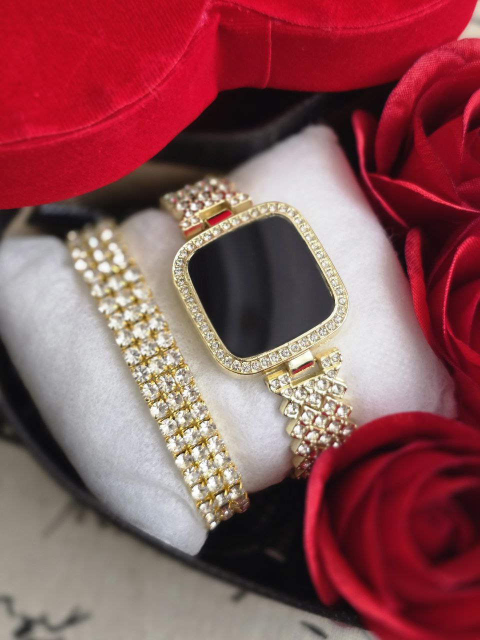 باکس هدیه زنانه و دخترانه ساعت دیجیتال LED لمسی و دستبند نگینی و باکس و گل