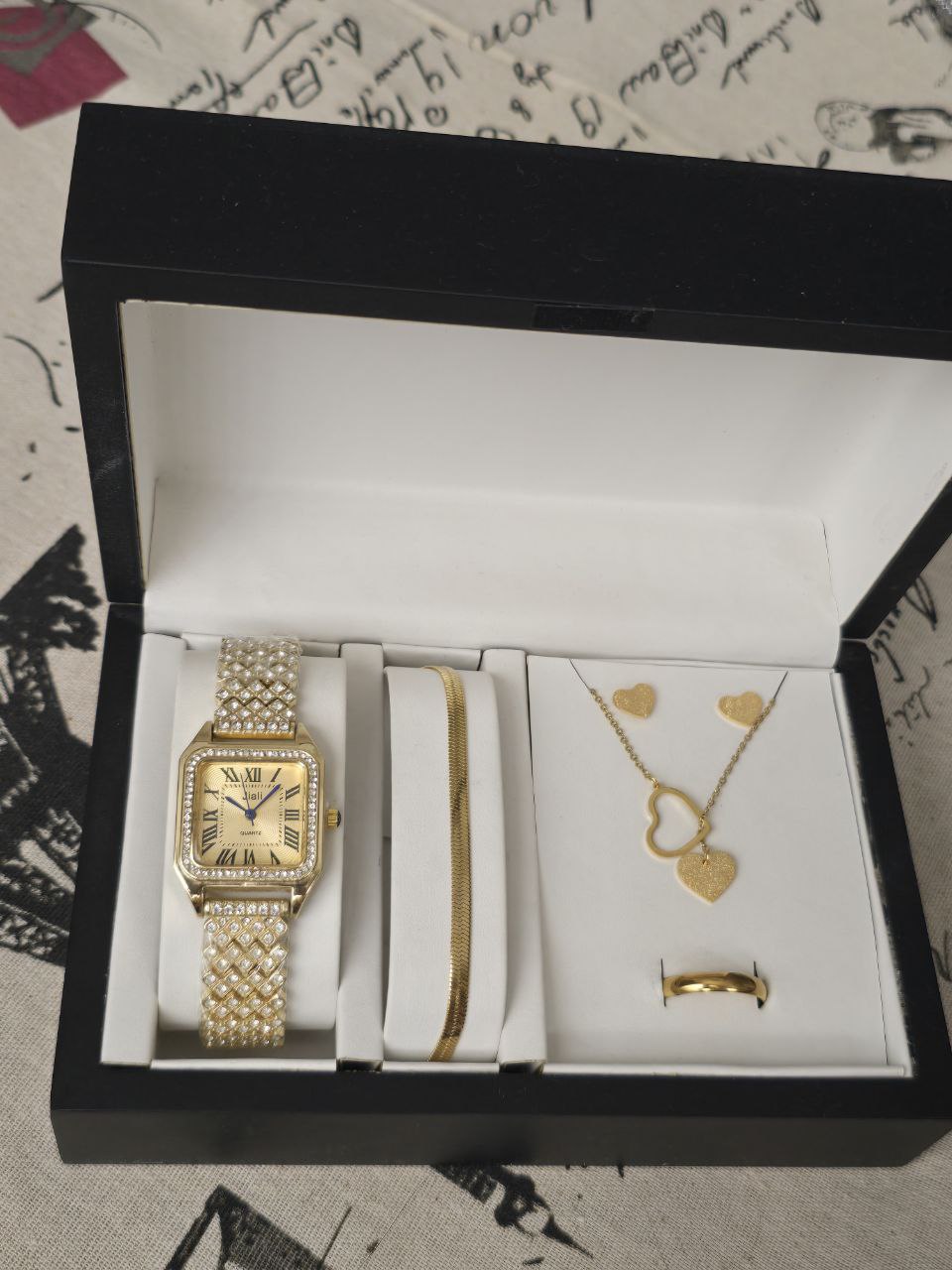 باکس هدیه زنانه و دخترانه ساعت و دستبند و نیمست استیل رنگ ثابت و باکس و گل