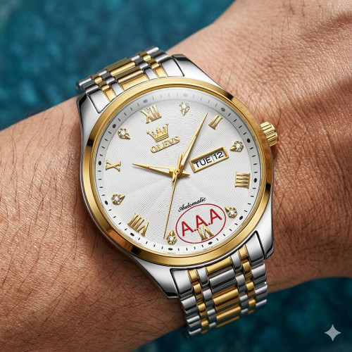 ساعت مچی مردانه برند OLEVS قفل کلیپیسی باکیفیت طراحی خاص و زیبا بند فلزی صفحه آبی موتور کوارتز روز شمار شب نما