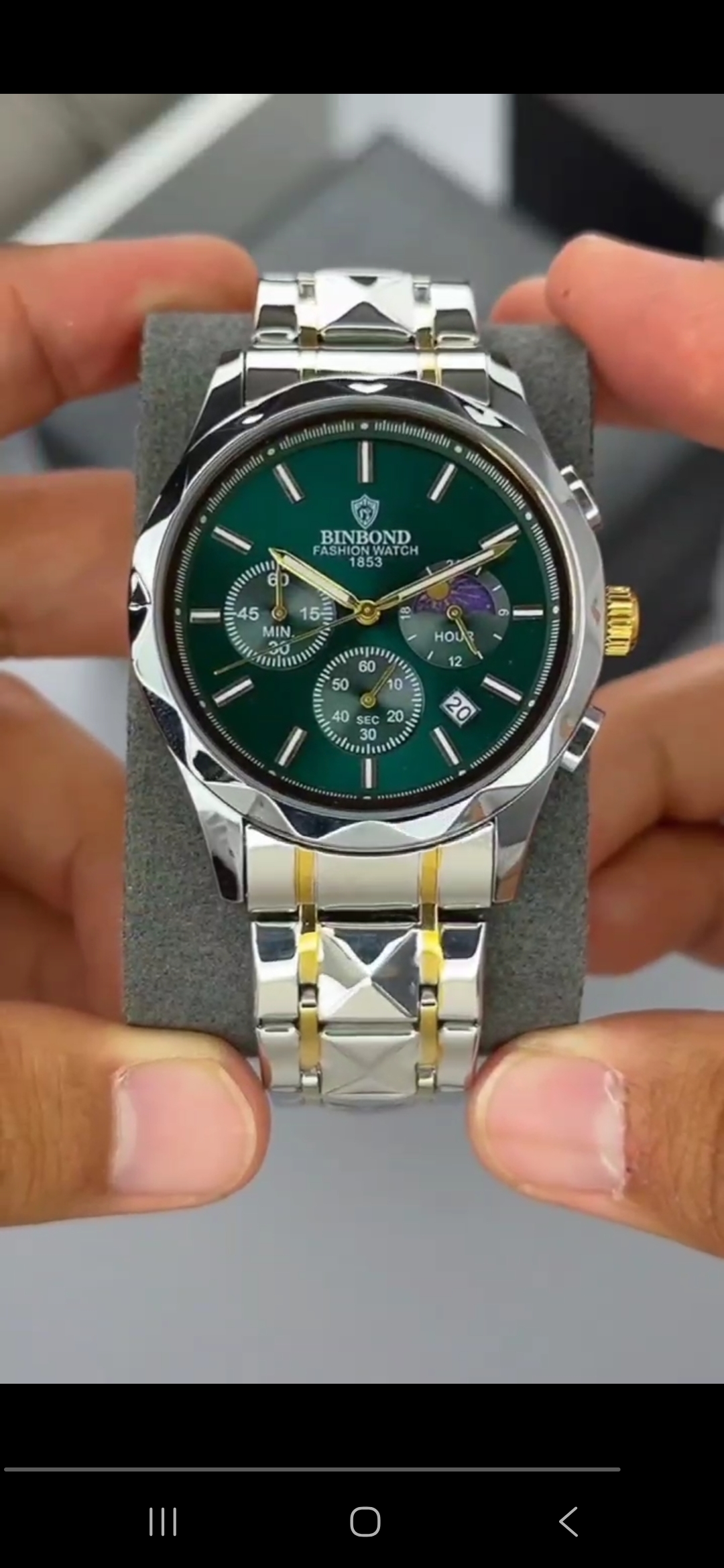 ساعت مچی مردانه برند ☑️BIN BOND 《highe quality》 Original watch ⌚️بین باند مدلی نو مردونه پرطرفدار مقاوم دربرابر آب برندشرکتی اوریجینال نمایش مون استار شب نما کرنوگراف دارای روز شمار ایام هفته بند استیل فولاد شیشه سافایر قفل دو پروانه موتور کوارتز