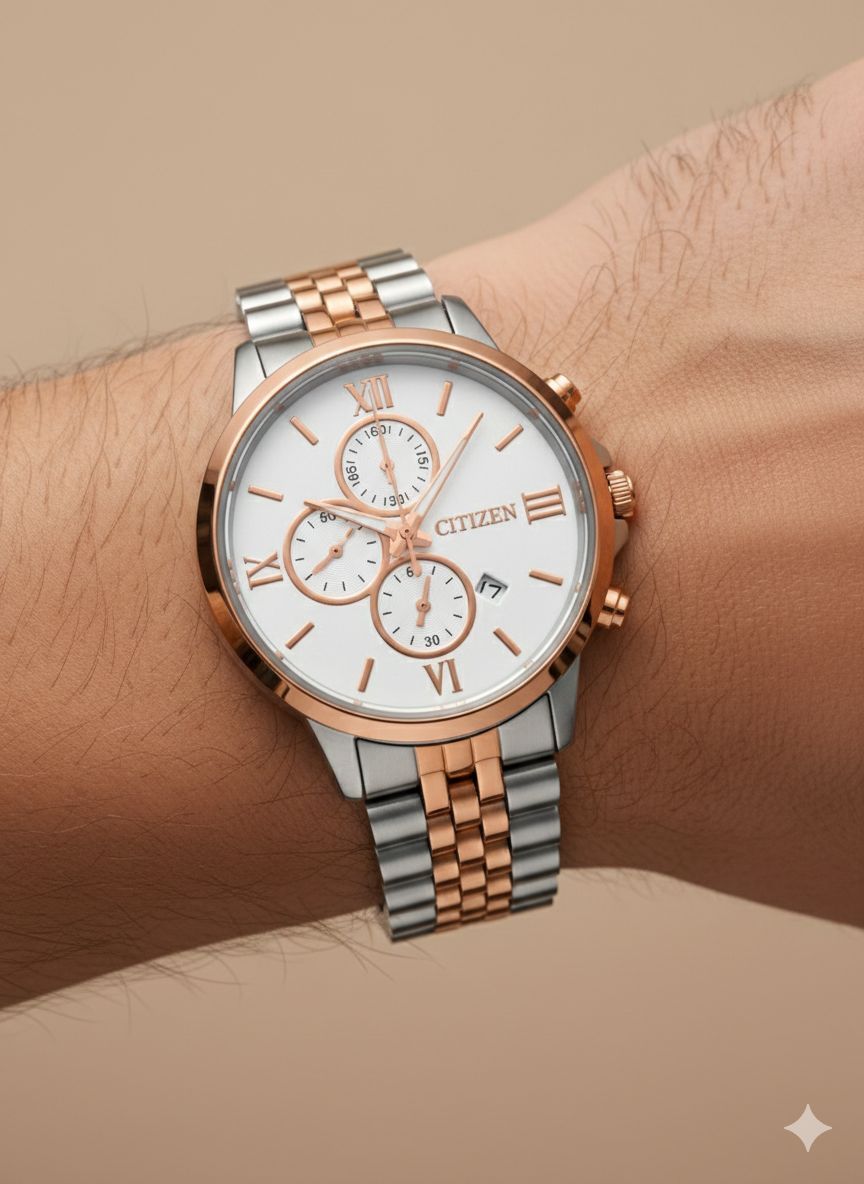 ساعت مچی مردانه کد 2304 مردانه برند سیتیزن CITIZEN باکیفیت بدنه استیل طراحی خاص و زیبا صفحه سفید موتور کوارتز روز شمار طرح سه موتوره