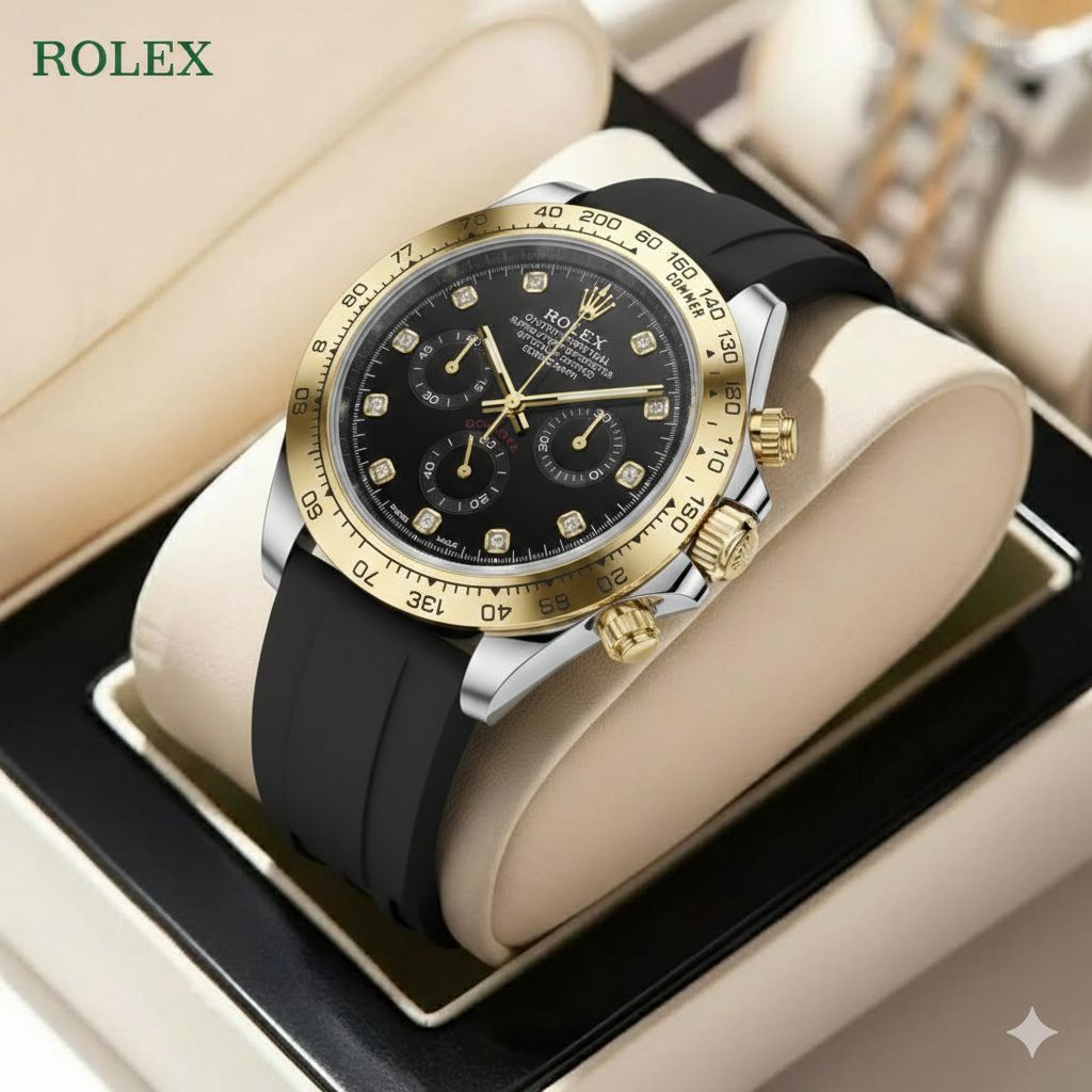 ساعت مچی مردانه کد 2303 مردانه برند رولکس ROLEX باکیفیت بدنه استیل طراحی خاص و زیبا صفحه مشکی موتور کوارتز روز شمار تلسکوپی