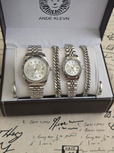 ست زوج برند رولکس ⌚️ دو عدد ساعت رولکس تاریخ دار دو عدد دستبند کارتیر استیل دو عدد حلقه استیل کیفیت عالی رنگ ثابت